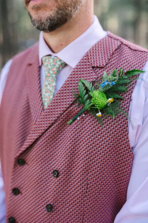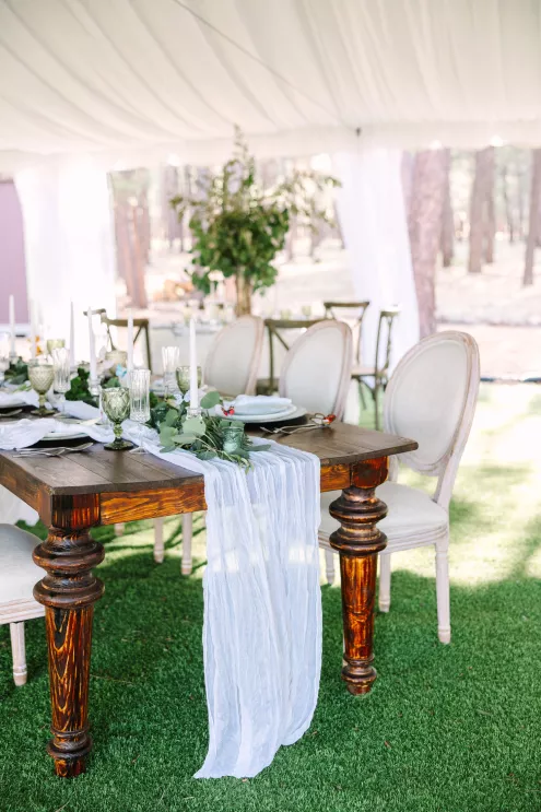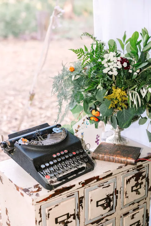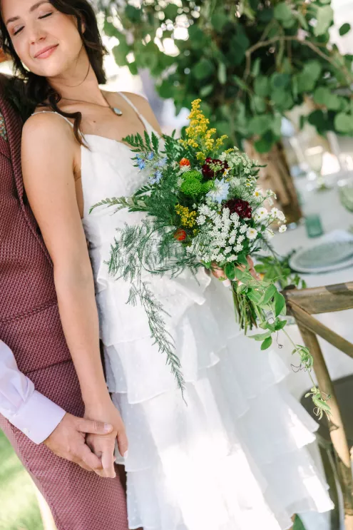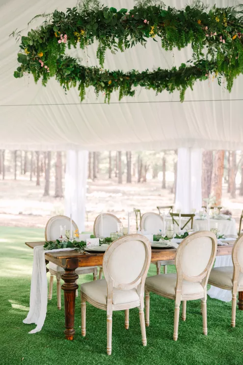 With a focus on highlighting the forest’s botanical beauty, Alexis Holle with Holiday Productions designed a seamless venue from ceremony to reception. With the stunning mountain scene as a backdrop, a stone stage and an archway of wild greenery framed the view, serving as an altar. Matching foliage highlighted the aisle, while vintage wooden chairs blended harmoniously into the scene, all coming together to create an already breathtaking venue that comes alive with an enchanting, vintage touch.