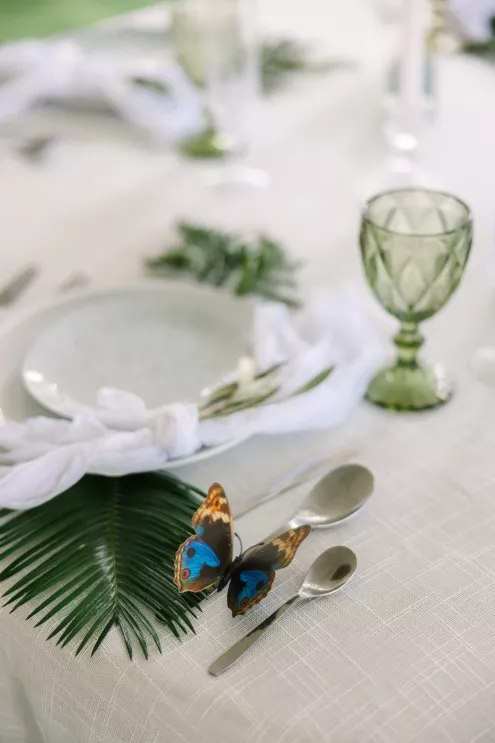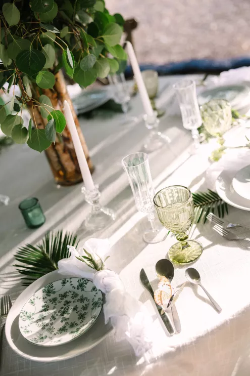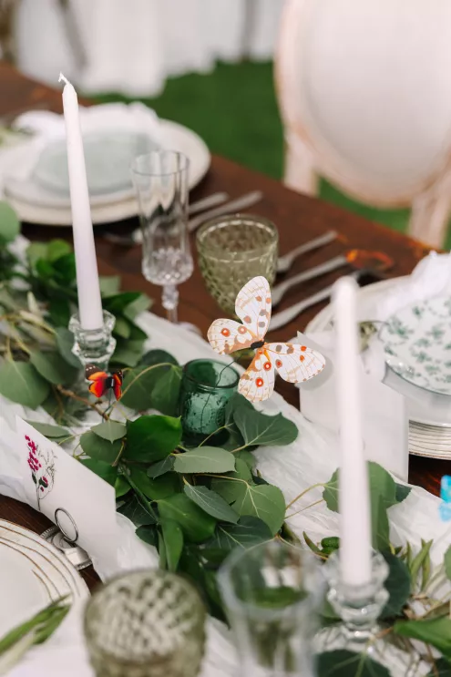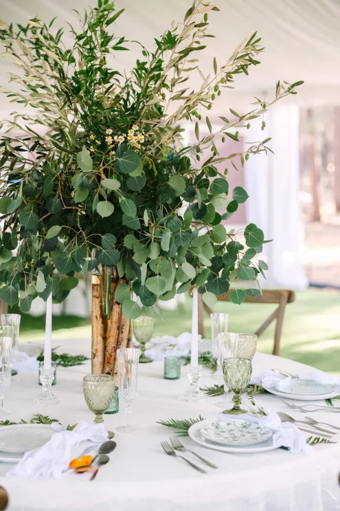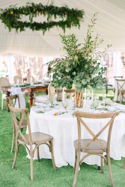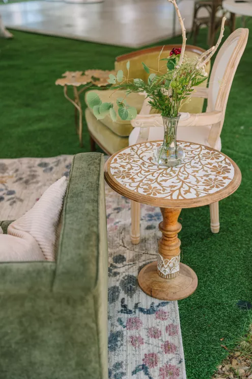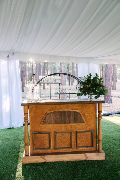 Next to the altar, white tents for the reception area sprouted throughout the grove. Beneath the tent hung a wreath of natural flora, little pops of sunset flowers poking through. The tables came fully alive with eucalyptus bouquets and vintage-inspired serving ware in varying hues of green. At the head table, a runner of botanics was placed, with whimsical butterfly adornments. A seating area was created for guests to mingle later in the evening, with classic furniture revitalized with varying green textures and patterns and an antique bar adorned with a variety of heirloom barware.