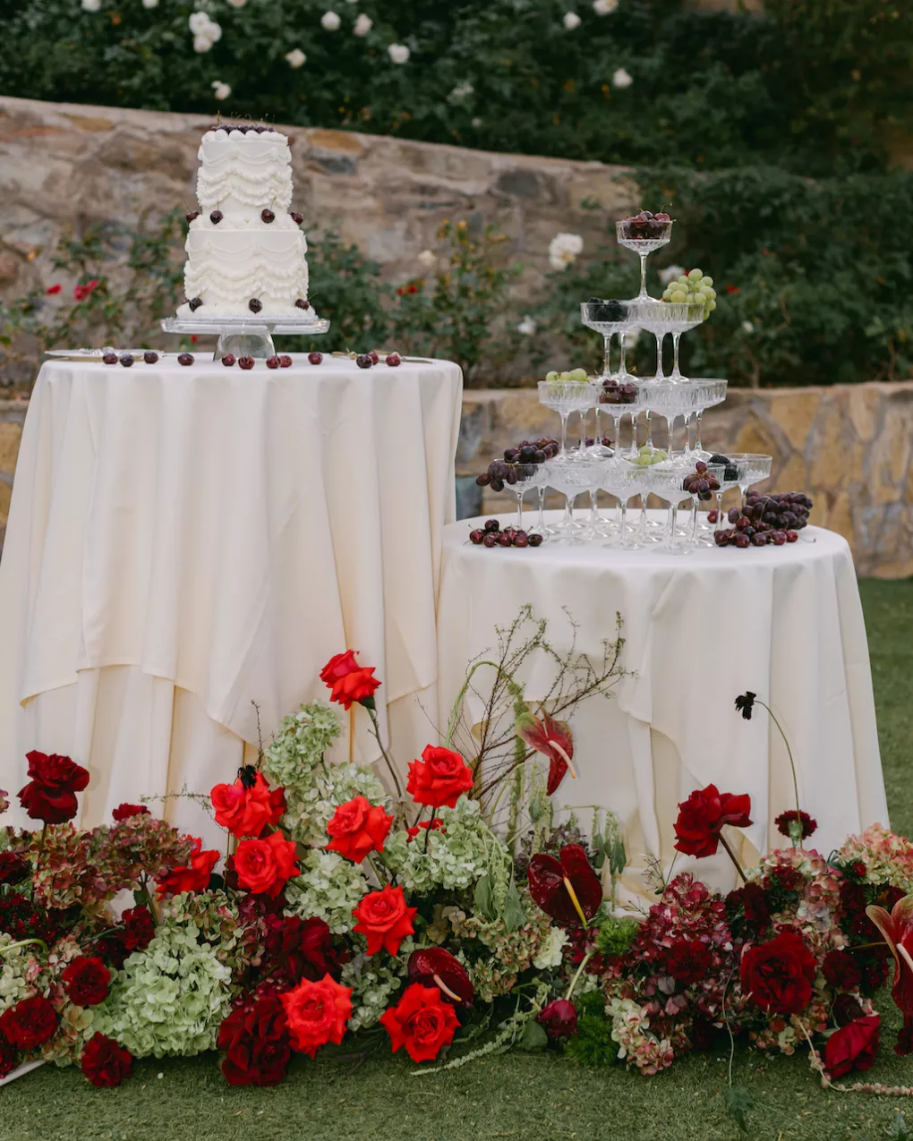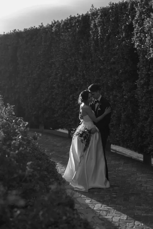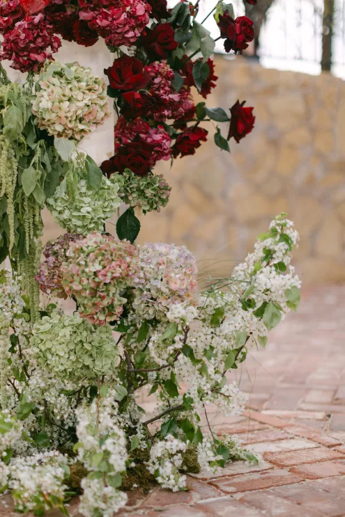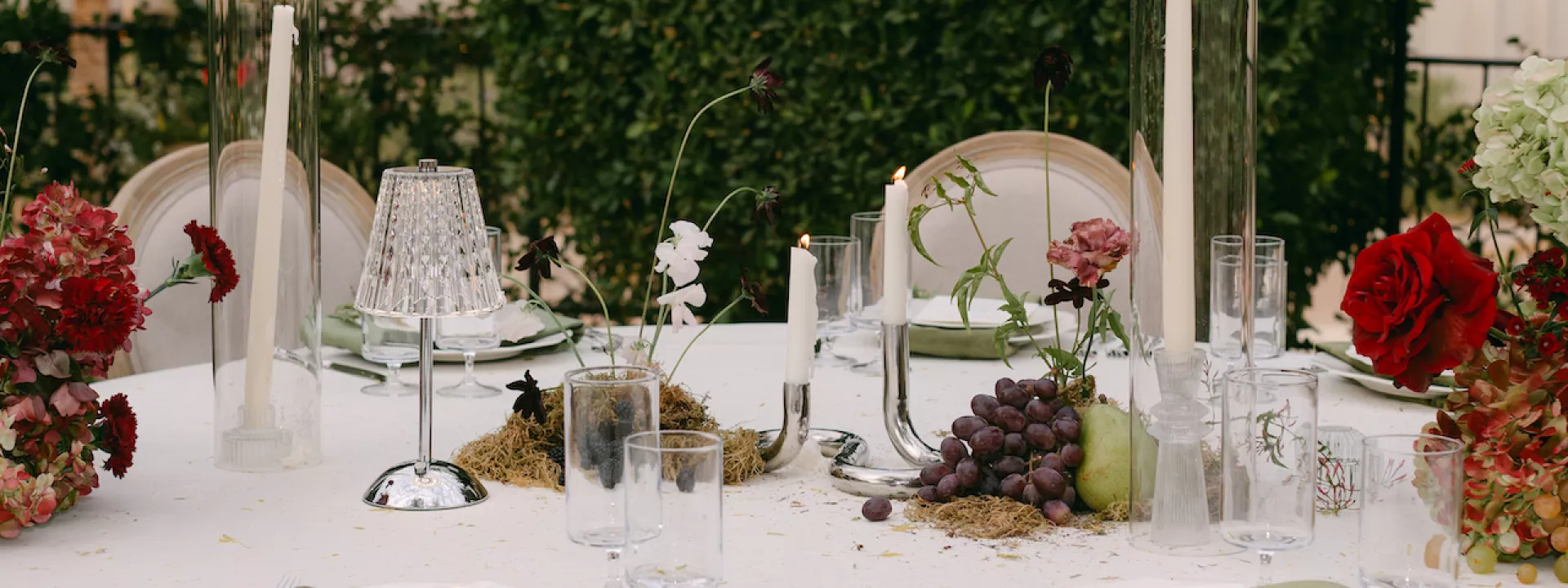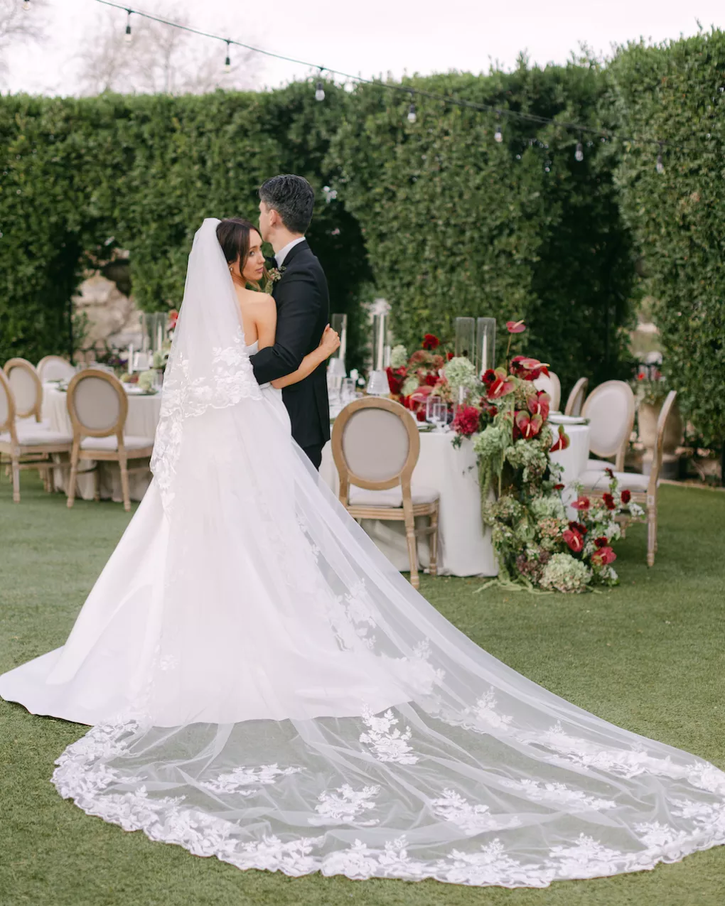 Inspired by Cupid's Garden, an imaginative vendor team designed Rachel and Taylor's faux wedding at Wrigley Mansion, which began along a terracotta-tiled staircase framed by lush floral pillars. As our bride would descend, she would create a very ethereal entrance, moving from the terrace above into view. After her entrance, guests' eyes would be drawn to rich red anthuriums, soft green hydrangea and cascading amaranthus forming an ardent, romantic palette. These florals would spill across a serpentine tablescape in ikebana fashion, transitioning naturally from ceremony to reception. Candlelight, moss, plum branches and fruit would layer the tablescape, balancing organic, sculptural and dreamy elements. Our bride's gown matched the drama with a cat-eye bodice, ballgown silhouette and lace-detailed veil with a romantic blusher. Our groom's classic black tuxedo provided a clean contrast to the surrounding whimsy. With winding florals, the dramatic staircase entrance and a dreamy garden tablescape, the day truly felt like a midsummer night's dream.