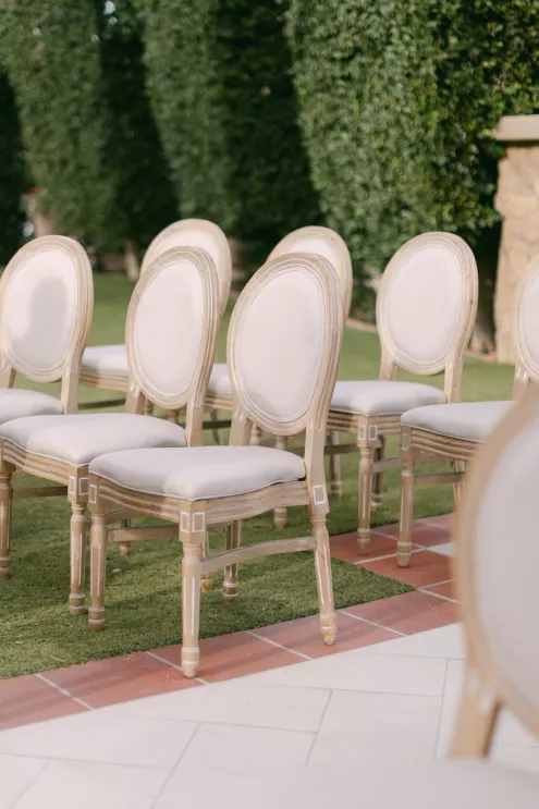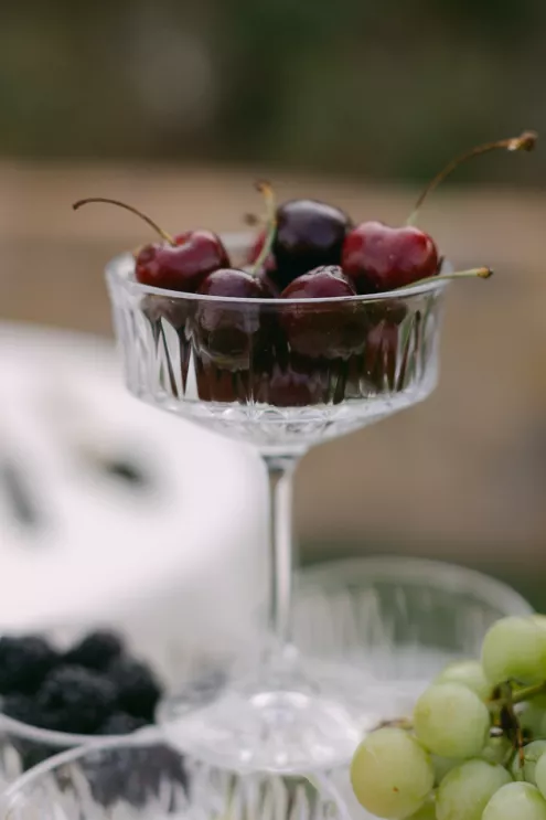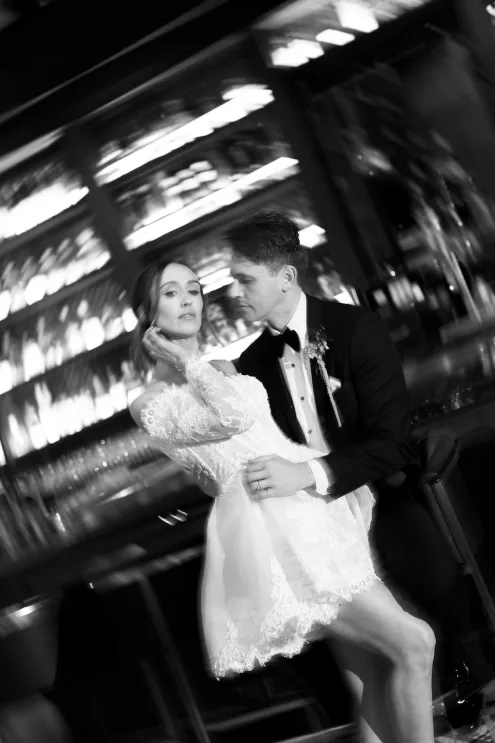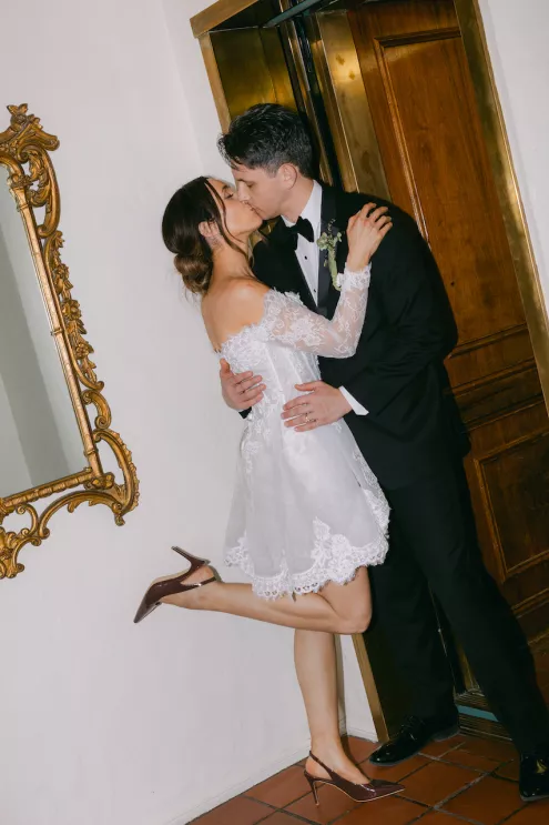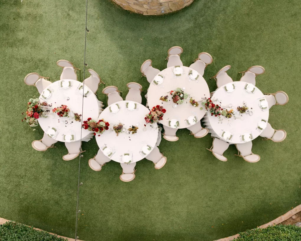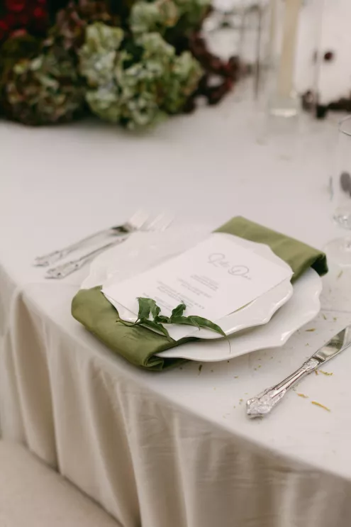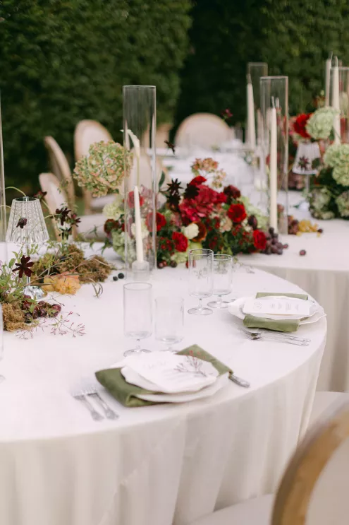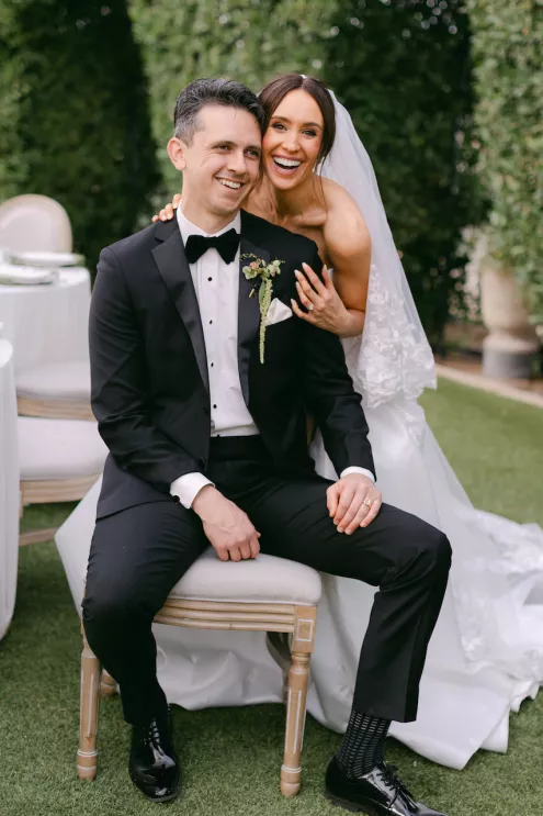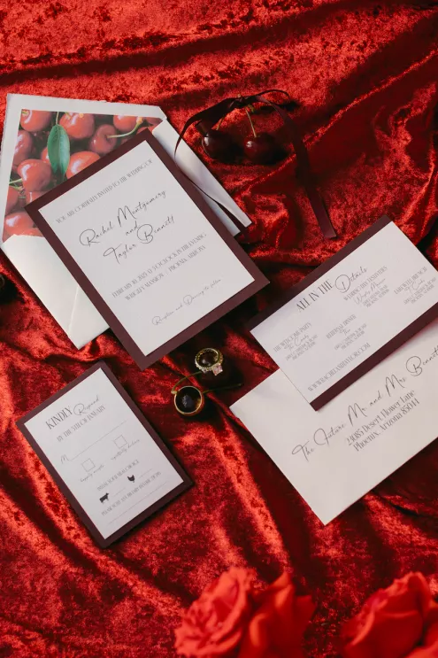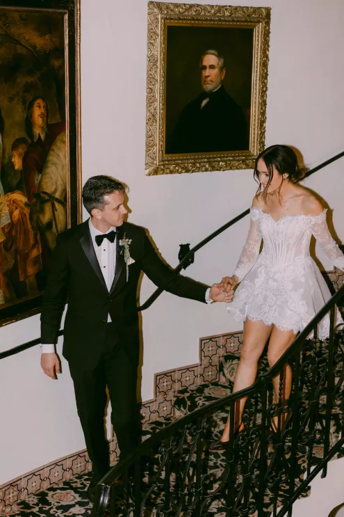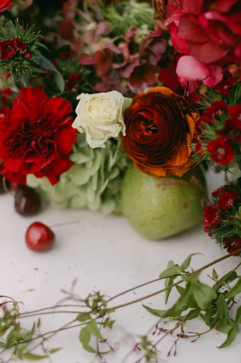 Inspired by Cupid's Garden, an imaginative vendor team designed Rachel and Taylor's faux wedding at Wrigley Mansion, which began along a terracotta-tiled staircase framed by lush floral pillars. As our bride would descend, she would create a very ethereal entrance, moving from the terrace above into view. After her entrance, guests' eyes would be drawn to rich red anthuriums, soft green hydrangea and cascading amaranthus forming an ardent, romantic palette. These florals would spill across a serpentine tablescape in ikebana fashion, transitioning naturally from ceremony to reception. Candlelight, moss, plum branches and fruit would layer the tablescape, balancing organic, sculptural and dreamy elements. Our bride's gown matched the drama with a cat-eye bodice, ballgown silhouette and lace-detailed veil with a romantic blusher. Our groom's classic black tuxedo provided a clean contrast to the surrounding whimsy. With winding florals, the dramatic staircase entrance and a dreamy garden tablescape, the day truly felt like a midsummer night's dream.