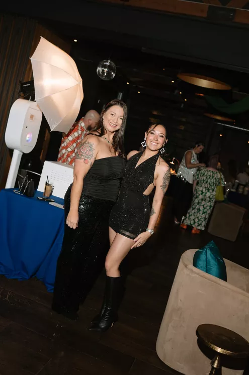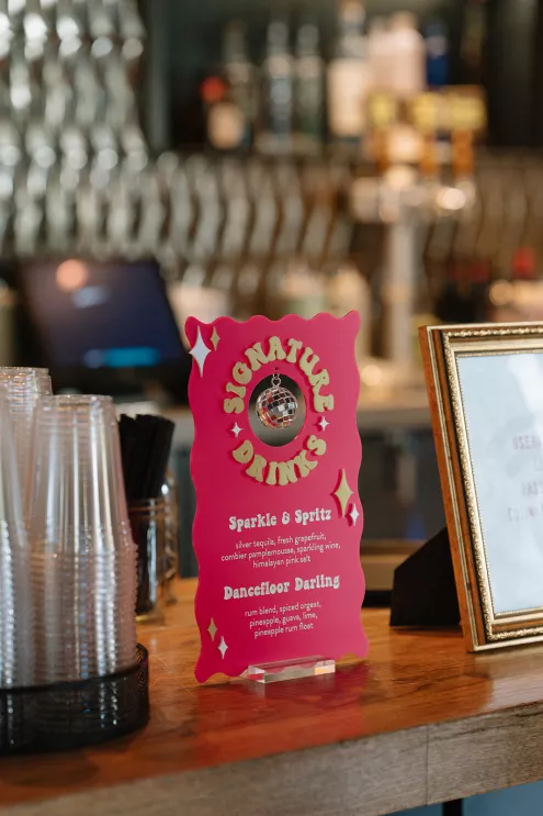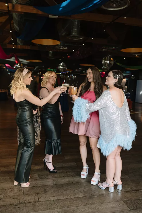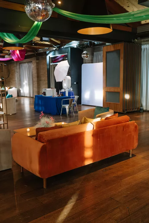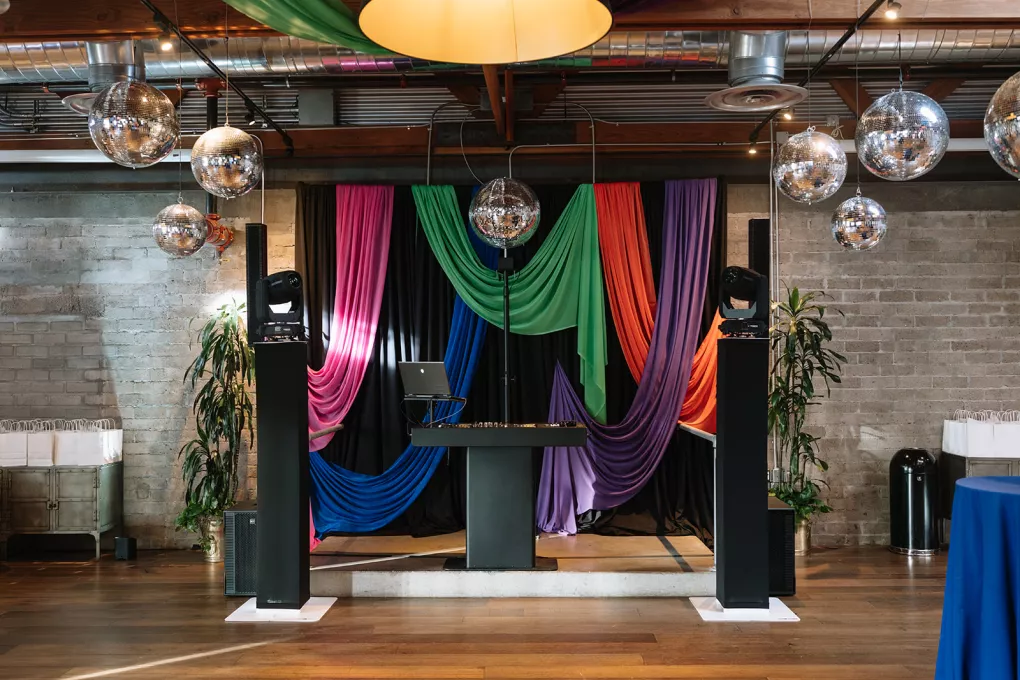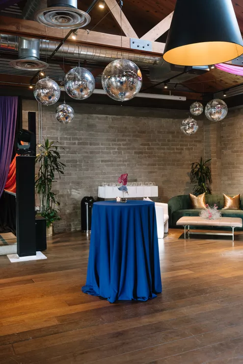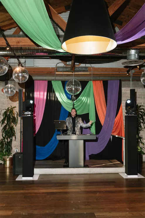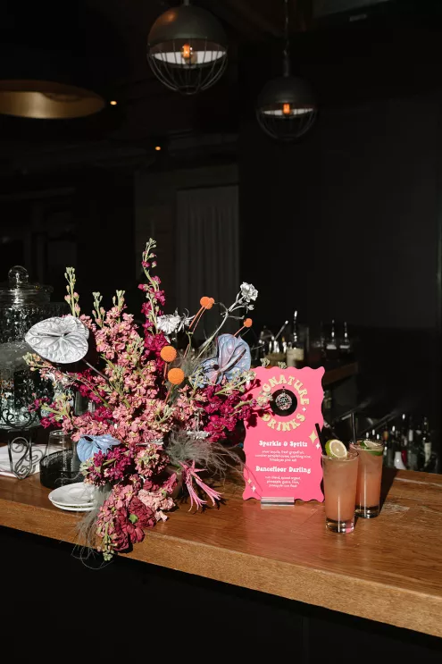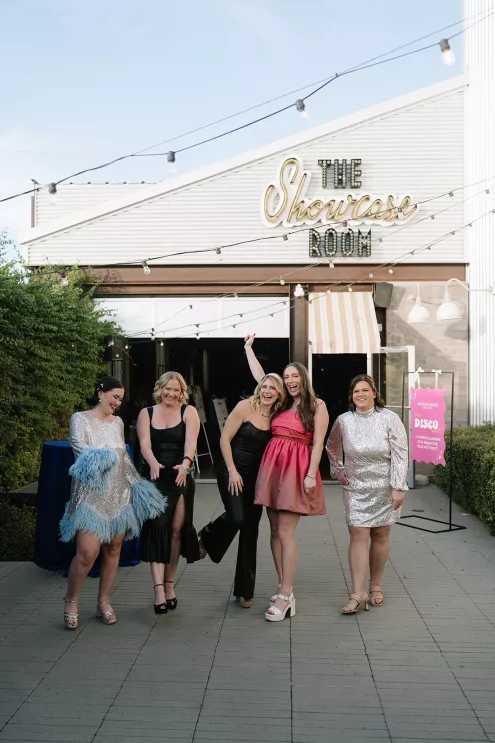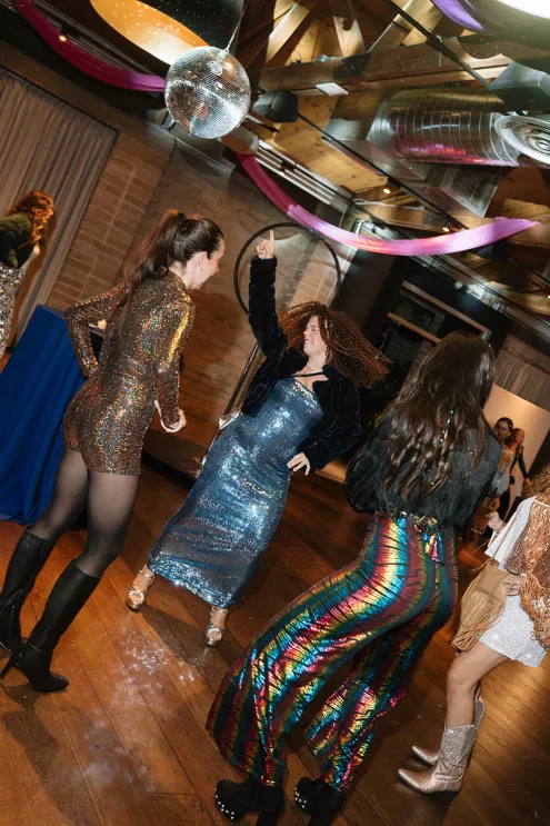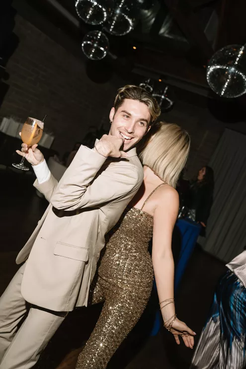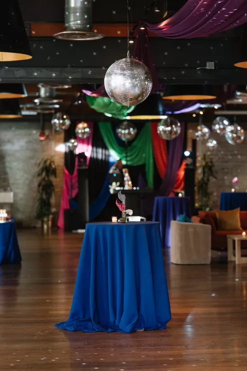 The venue was transformed with layered lounge vignettes, glassware and bar backs by Confetti Studio, paired with vibrant draping, linens and shimmering disco balls from Divinity Event Lighting. Lush floral moments by Stoddard Floral added texture and movement throughout the space, while custom graphics by Copper Cactus and statement signage from Made by Madi Design Co. brought The Disco Edit to life visually.