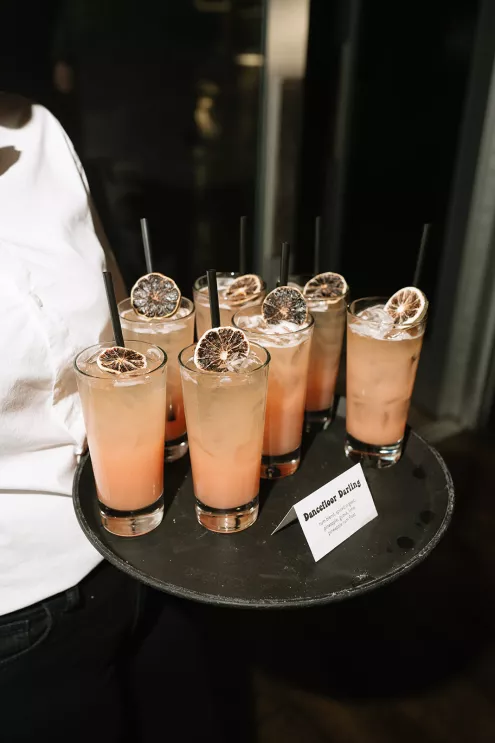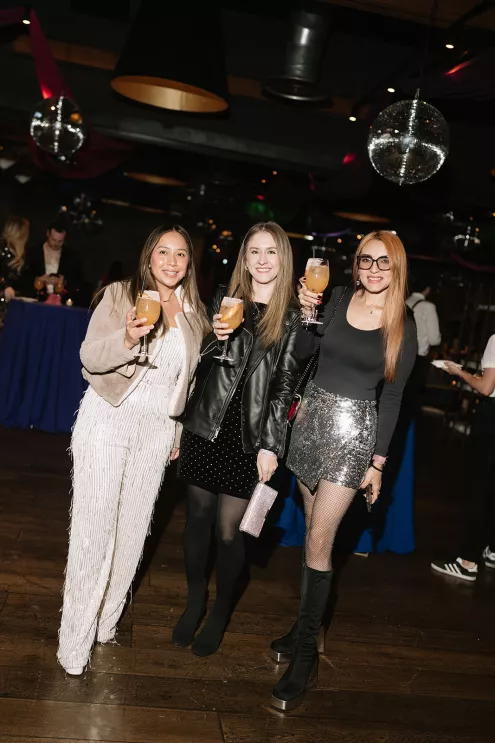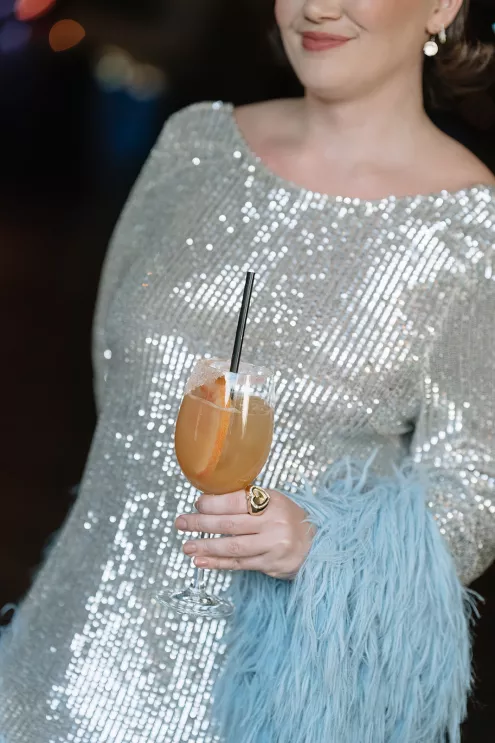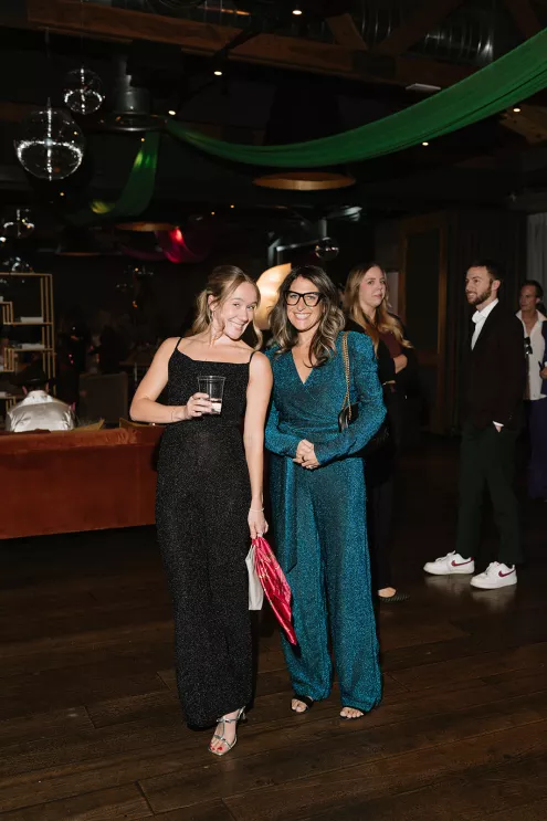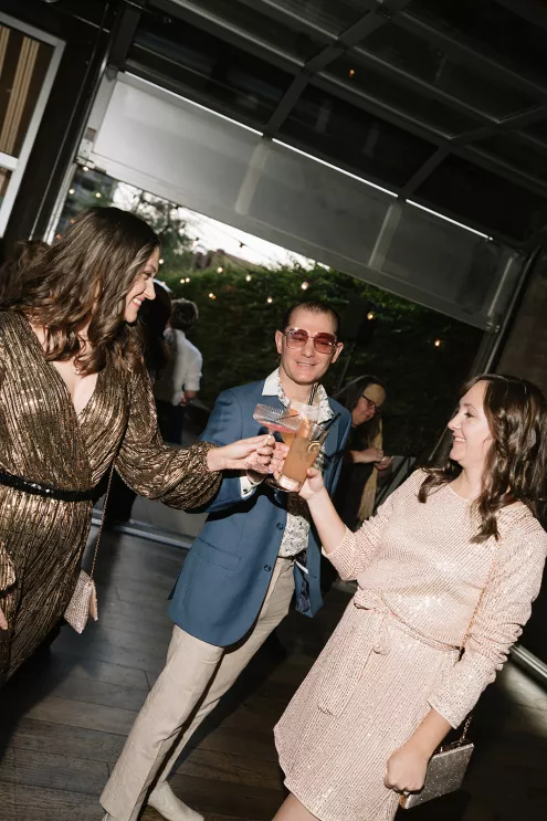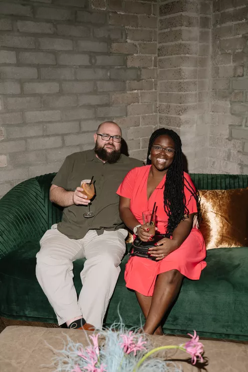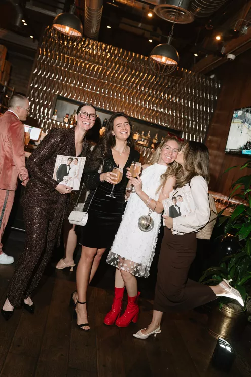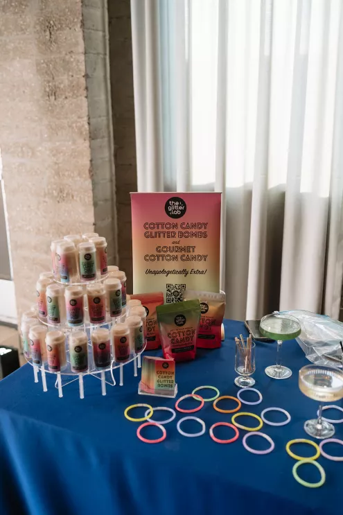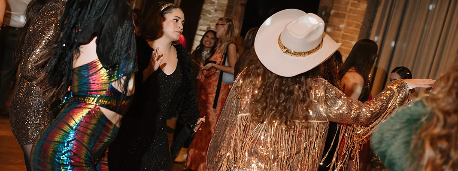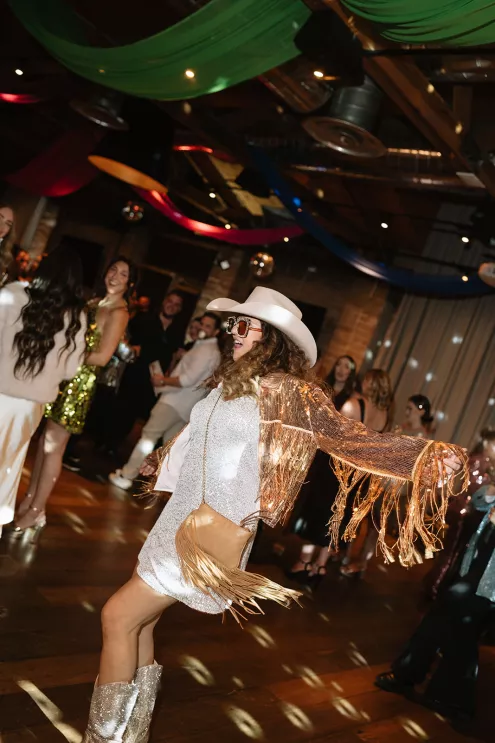 The venue was transformed with layered lounge vignettes, glassware and bar backs by Confetti Studio, paired with vibrant draping, linens and shimmering disco balls from Divinity Event Lighting. Lush floral moments by Stoddard Floral added texture and movement throughout the space, while custom graphics by Copper Cactus and statement signage from Made by Madi Design Co. brought The Disco Edit to life visually.