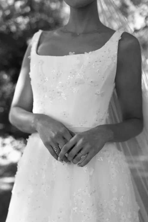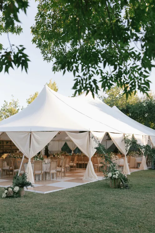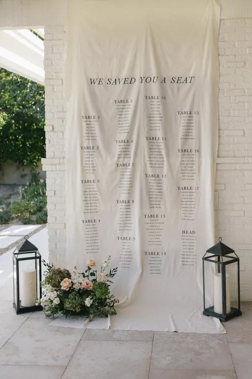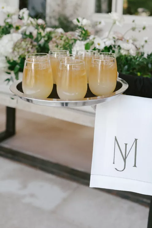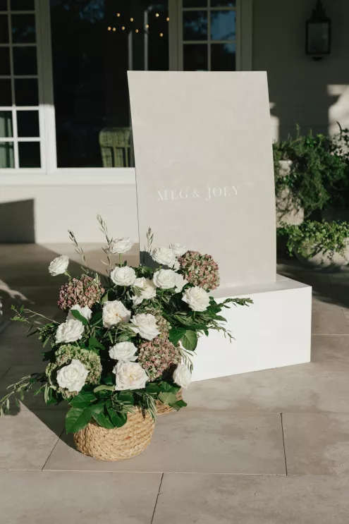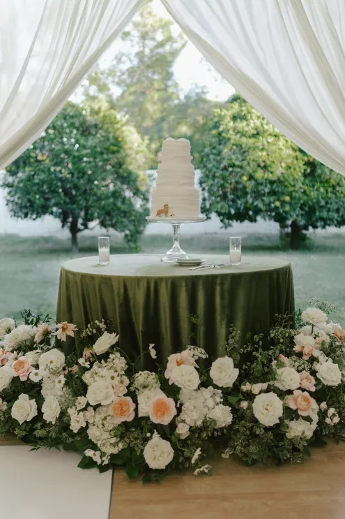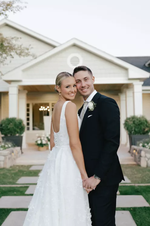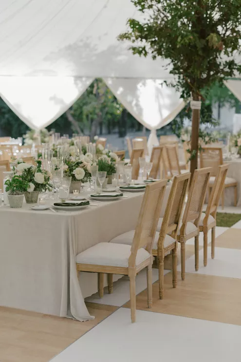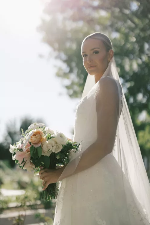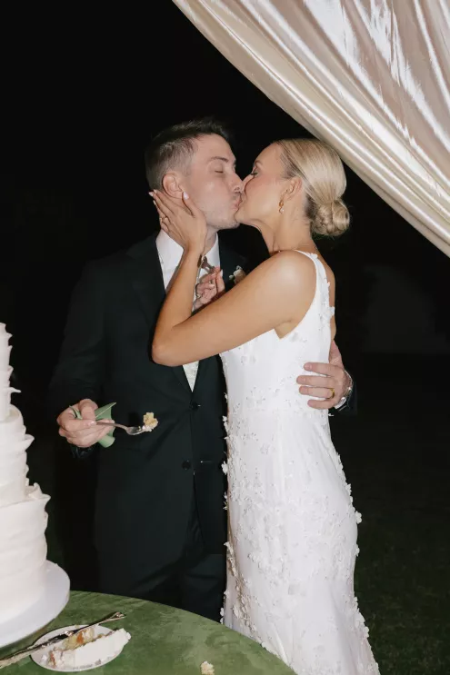 A Bumble success story for the ages, Meg fell in love with the only man she considered worthy of going on a date with from the app—Joey. Aiming to embody her grandmother’s simple, elegant dinner parties and “incredible ability to bring people together with warmth, laughter and a sense of belonging,” Meg wanted her wedding day to be intimate, chic and full of personal touches. Starting their big day with a slow morning spent at home, the pair watched as Meg’s parents’ backyard was transformed into a breathtaking ceremony and reception space. Inspired by the timeless wedding in the movie, Father of the Bride, traditional décor was thoughtfully incorporated throughout the space to foster an environment that was both refined and welcoming. Full white roses bloomed alongside blush blossoms and lush foliage, the abundant display climbing up a large tree to create a unique altar where Joey and Meg exchanged their “I do’s.” Incorporating the fresh hues of their décor, Joey wore a subtly patterned tie with his black suit while Meg was a portrait of bridal beauty in a gown delicately adorned with petal appliqués. Billowing in the breeze, a fabric seating chart led guests to the tented reception, where tastefully decorated tables glowed with warm candlelight. “It was surreal to witness all the love and effort come together in a place that holds so much significance,” Meg reflects. “The joy of being surrounded by every living person we love...there’s truly nothing like that feeling.”