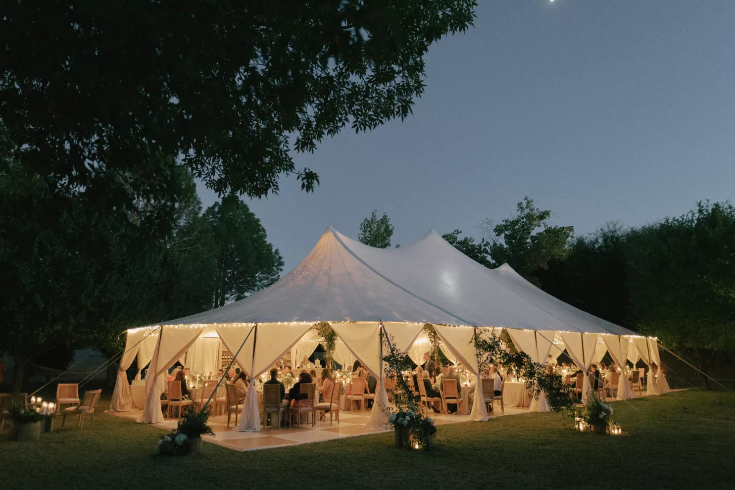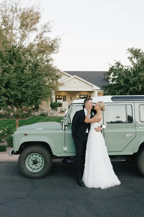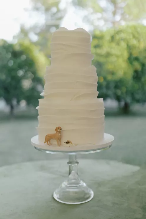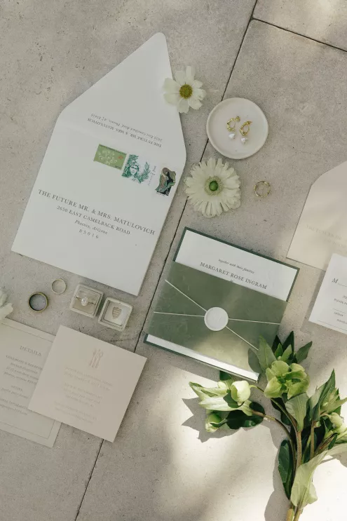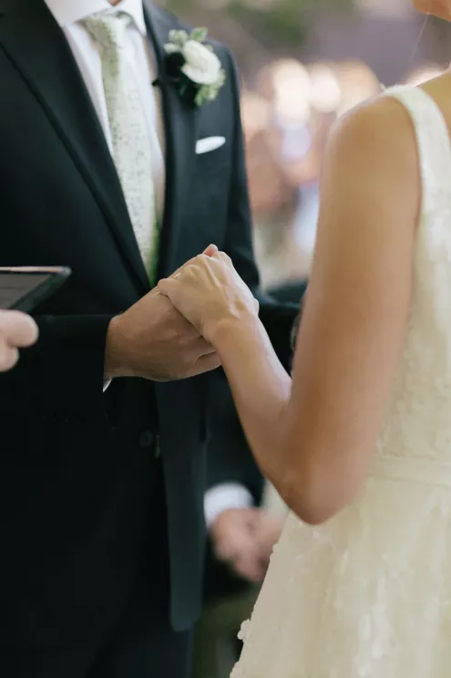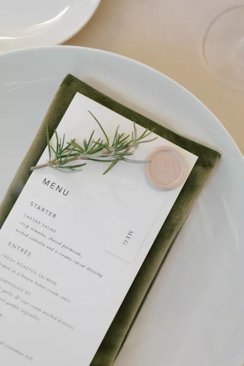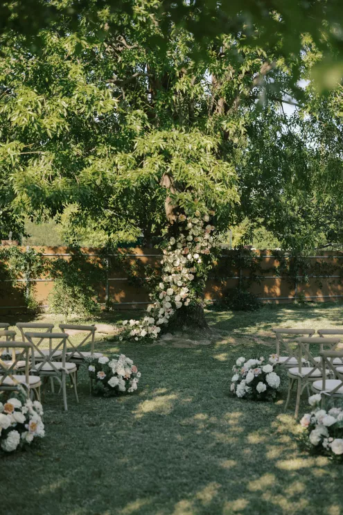 A Bumble success story for the ages, Meg fell in love with the only man she considered worthy of going on a date with from the app—Joey. Aiming to embody her grandmother’s simple, elegant dinner parties and “incredible ability to bring people together with warmth, laughter and a sense of belonging,” Meg wanted her wedding day to be intimate, chic and full of personal touches. Starting their big day with a slow morning spent at home, the pair watched as Meg’s parents’ backyard was transformed into a breathtaking ceremony and reception space. Inspired by the timeless wedding in the movie, Father of the Bride, traditional décor was thoughtfully incorporated throughout the space to foster an environment that was both refined and welcoming. Full white roses bloomed alongside blush blossoms and lush foliage, the abundant display climbing up a large tree to create a unique altar where Joey and Meg exchanged their “I do’s.” Incorporating the fresh hues of their décor, Joey wore a subtly patterned tie with his black suit while Meg was a portrait of bridal beauty in a gown delicately adorned with petal appliqués. Billowing in the breeze, a fabric seating chart led guests to the tented reception, where tastefully decorated tables glowed with warm candlelight. “It was surreal to witness all the love and effort come together in a place that holds so much significance,” Meg reflects. “The joy of being surrounded by every living person we love...there’s truly nothing like that feeling.”