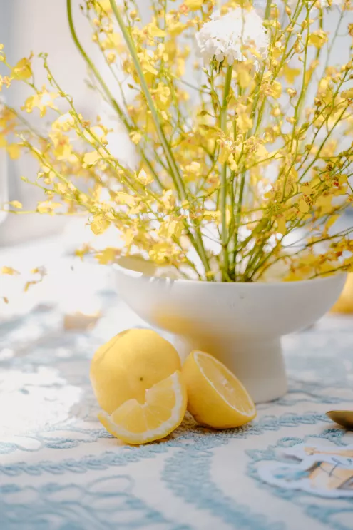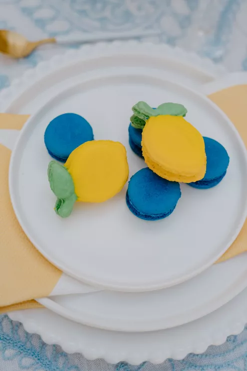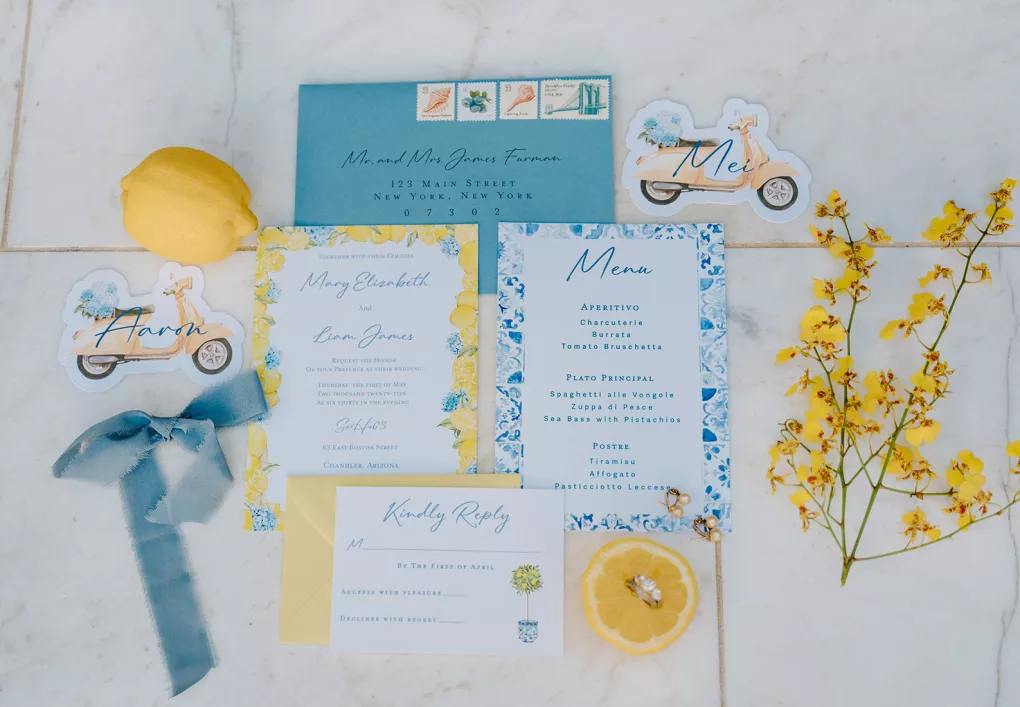 “The floral design embraces bold color with a light touch,” adds Hunter Stoddard, owner of Stoddard Floral & Co. “Lemons mingled with lush garden blooms in sunlit arrangements that spilled across tables and ceremony details.” The table displayed textured linens, café-style lanterns, fresh lemons and playful Vespa-shaped name cards that doubled as keepsakes. A custom invitation suite, accented with delicate calligraphy, echoed the coastal palette and set the tone for a celebration full of personality and style. Lemon- shaped macaron cookies added a sweet finishing touch.