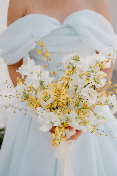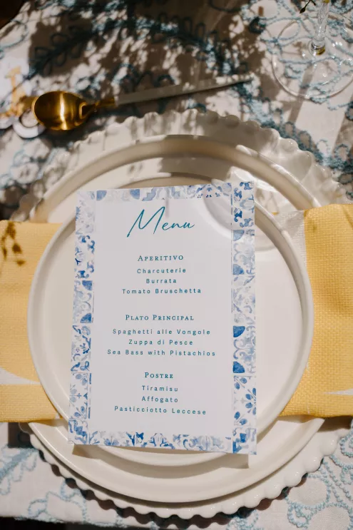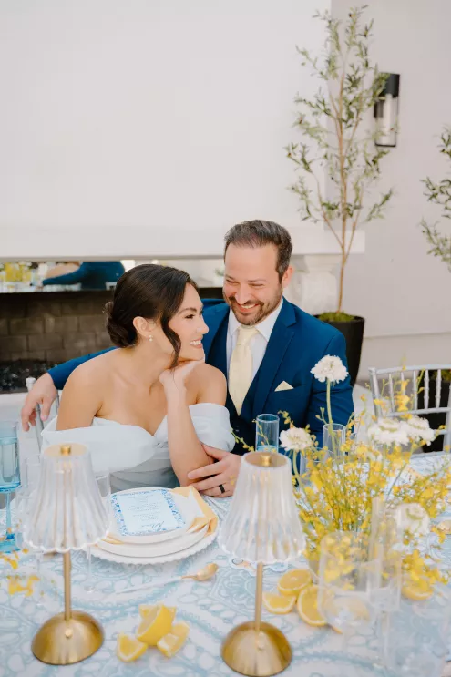 “The color story featured dreamy hues of oceanic blue, crisp whites and pops of bright, lemony yellow—a nod to the citrus groves and iconic seaside towns of southern Italy,” says Abby Barenholtz of Copper Blossom Events. “This lively palette brought a sense of movement and joy to every element, from the florals to the tablescape.”