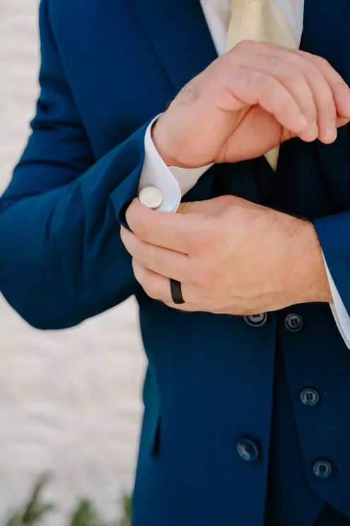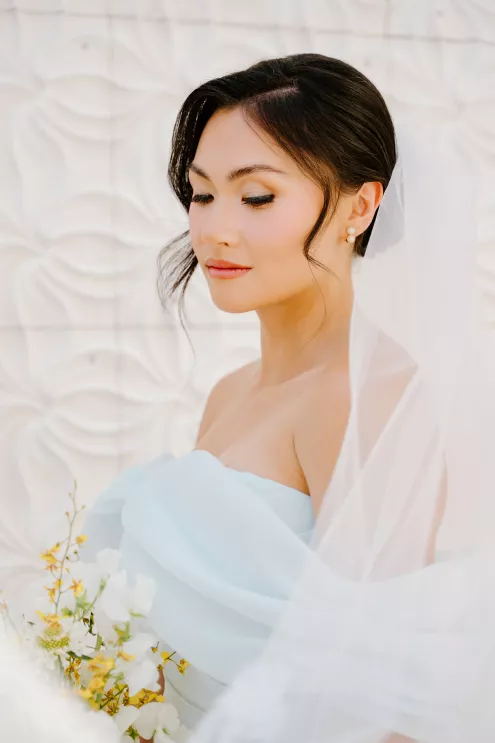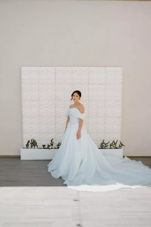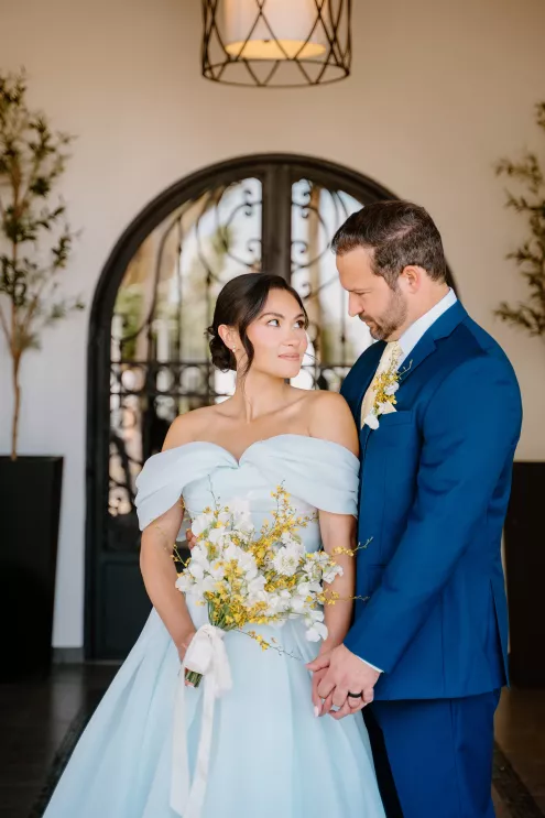 The bride embraced “something blue” in a daring baby blue gown that was elegant and effortless. The groom complemented her look in a coordinating blue ensemble.