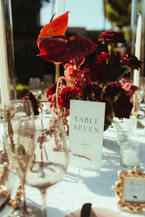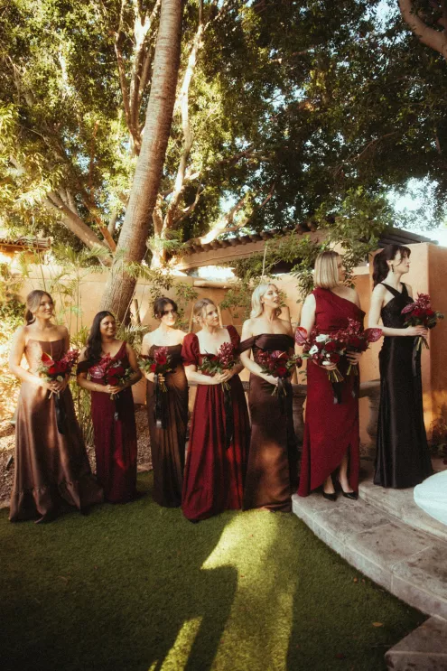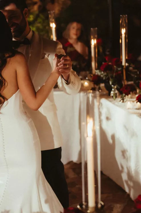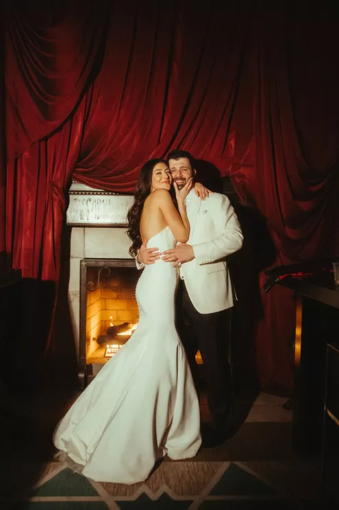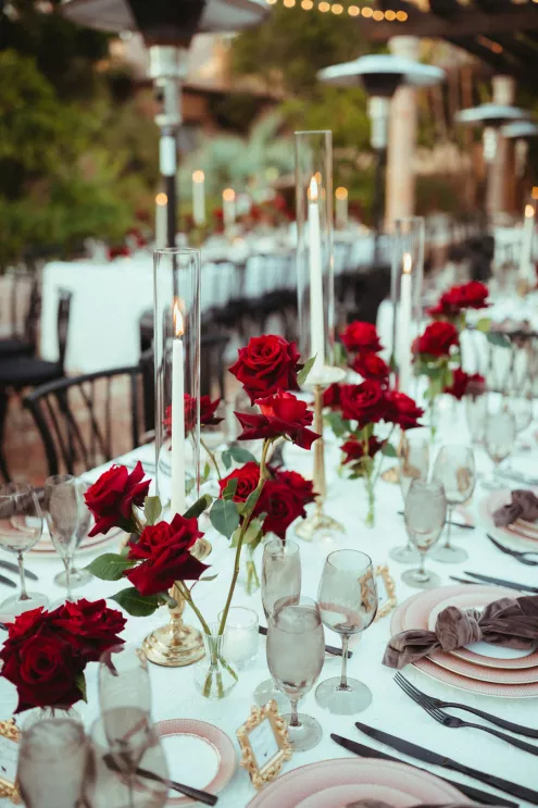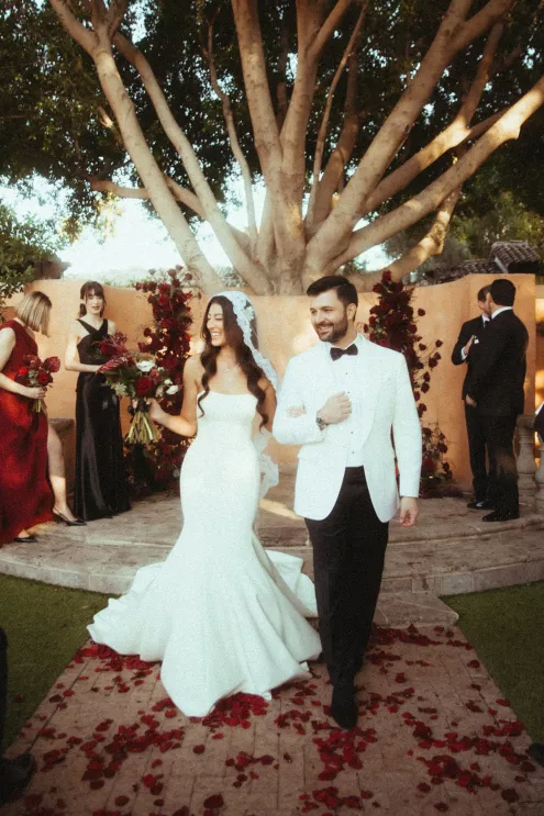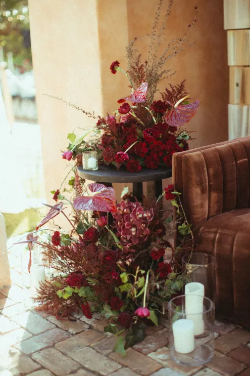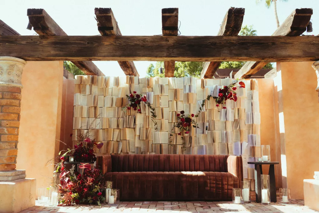 Juliana and Nick’s wedding at Royal Palms Resort and Spa unfolded like a cinematic love story—an ode to passion, artistry and intention steeped in Italian romance. High school sweethearts turned life partners; the two share a love of reading, travel and timeless design, all of which shaped their day. The celebration unfolded as an immersive experience, blending moody sophistication with deeply personal storytelling. The palette centered on rich burgundy tones—a choice that spoke to Juliana’s bold spirit and the couple’s refusal to blend into the expected. The ceremony featured towering crimson florals and a carpet of rose petals, setting the tone for a grand evening. As guests moved from ceremony to dinner, the atmosphere deepened in richness and texture. Candlelight flickered across velvet-draped tablescapes of gold and glass while cascading blooms and wine-hued drapery transformed the fireplace into a cinematic focal point. Dinner paid homage to Nick’s Italian heritage with a four-course menu followed by favor boxes brimming with authentic Italian desserts and mini wedding cake. In the lounge, a custom book wall served as both art installation and love letter to the couple’s shared passion for reading—sculptural, sentimental and perfectly symbolic of two individuals writing their next chapter together.