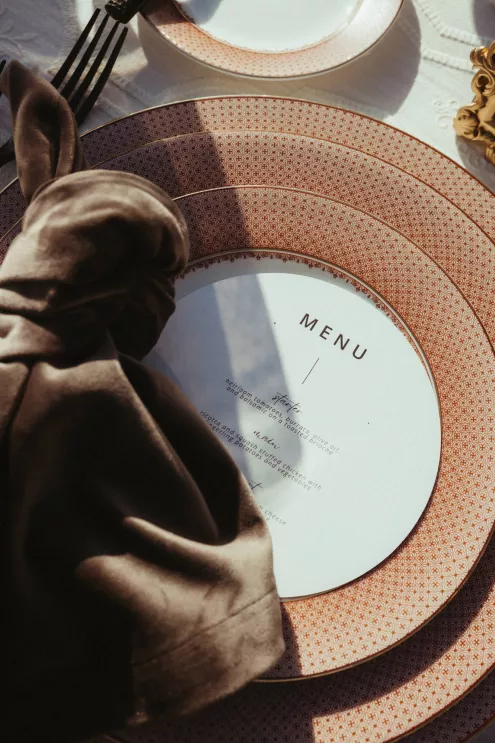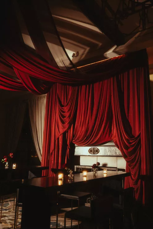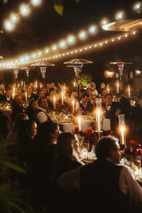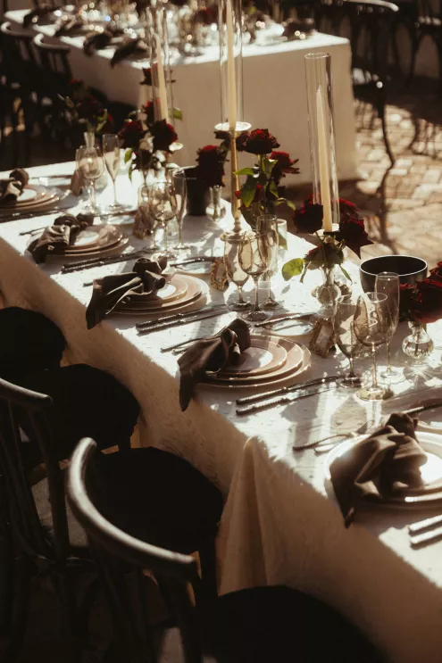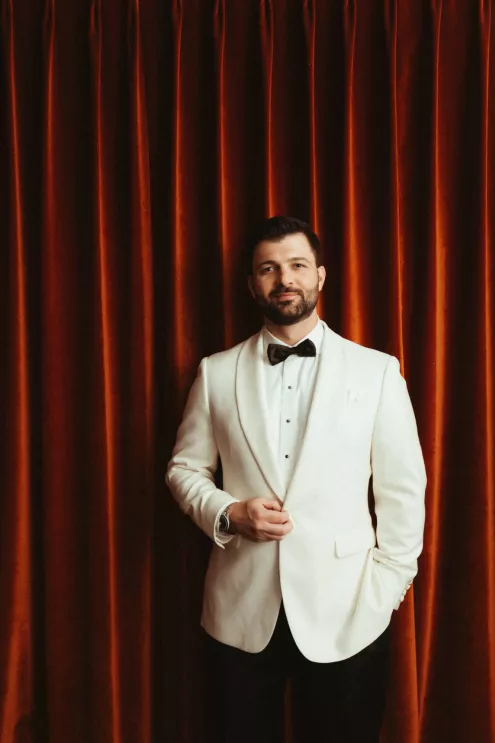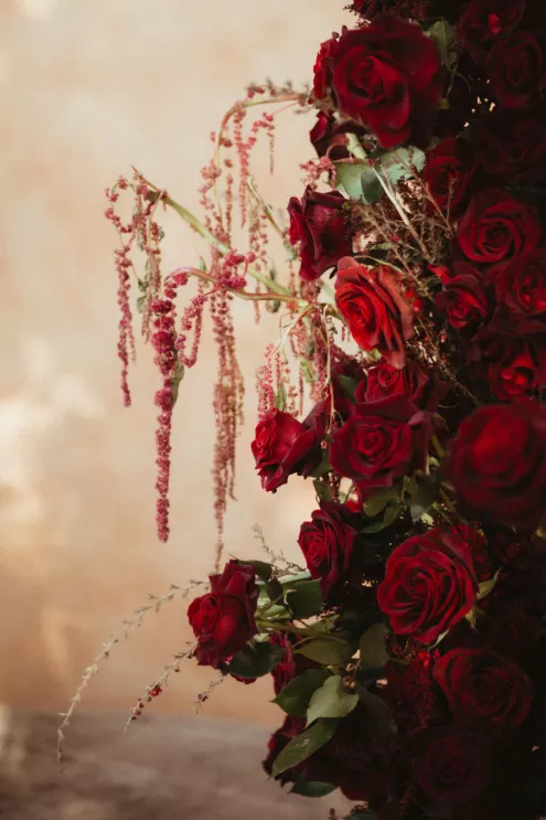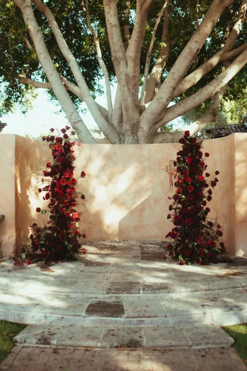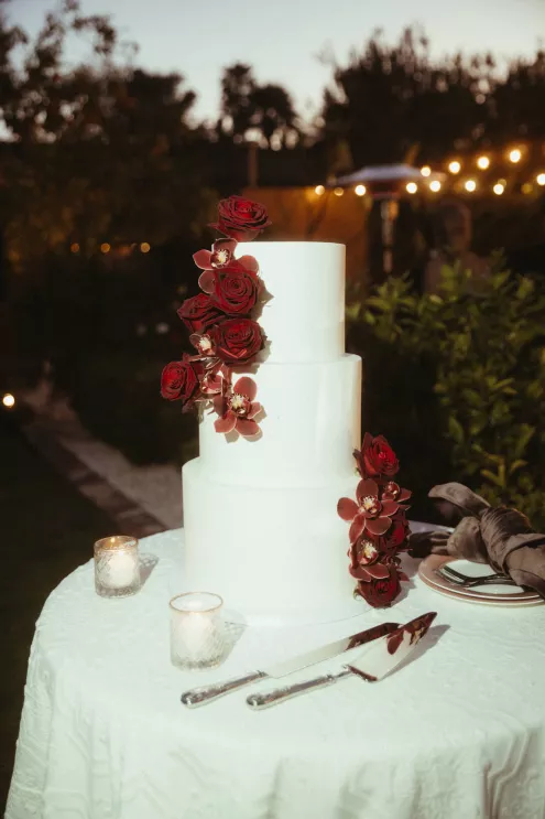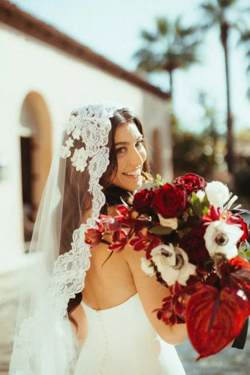 Juliana and Nick’s wedding at Royal Palms Resort and Spa unfolded like a cinematic love story—an ode to passion, artistry and intention steeped in Italian romance. High school sweethearts turned life partners; the two share a love of reading, travel and timeless design, all of which shaped their day. The celebration unfolded as an immersive experience, blending moody sophistication with deeply personal storytelling. The palette centered on rich burgundy tones—a choice that spoke to Juliana’s bold spirit and the couple’s refusal to blend into the expected. The ceremony featured towering crimson florals and a carpet of rose petals, setting the tone for a grand evening. As guests moved from ceremony to dinner, the atmosphere deepened in richness and texture. Candlelight flickered across velvet-draped tablescapes of gold and glass while cascading blooms and wine-hued drapery transformed the fireplace into a cinematic focal point. Dinner paid homage to Nick’s Italian heritage with a four-course menu followed by favor boxes brimming with authentic Italian desserts and mini wedding cake. In the lounge, a custom book wall served as both art installation and love letter to the couple’s shared passion for reading—sculptural, sentimental and perfectly symbolic of two individuals writing their next chapter together.