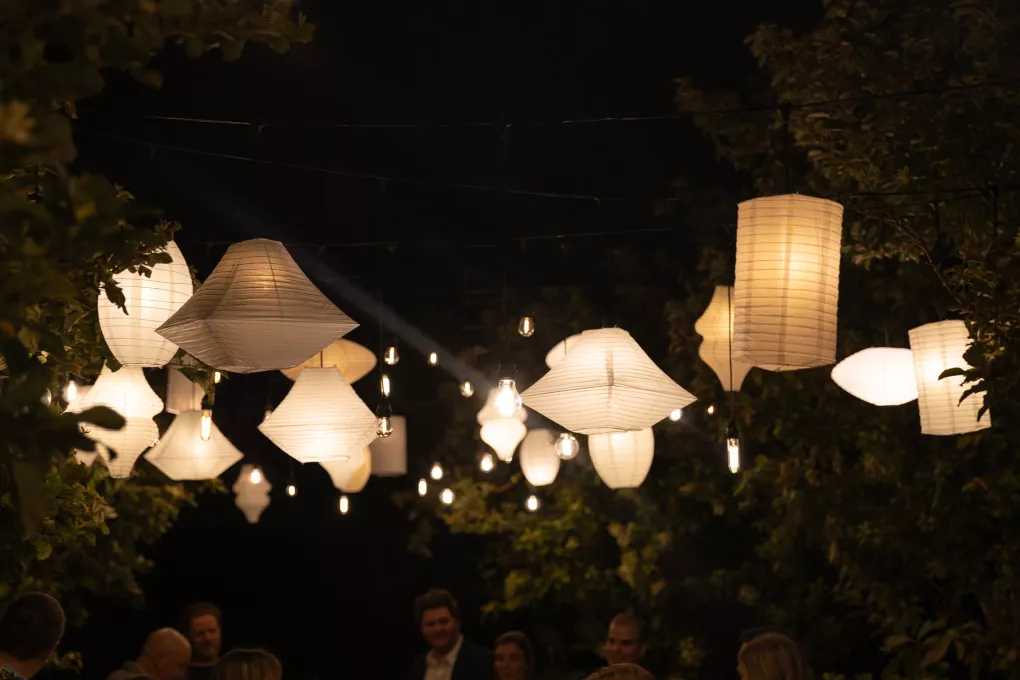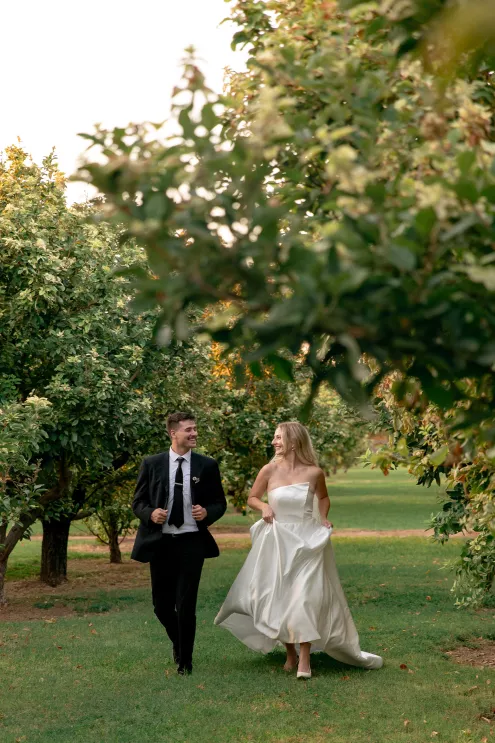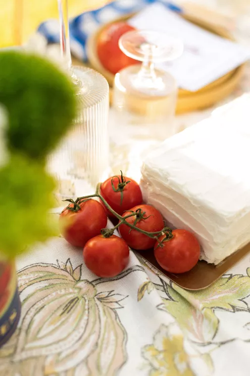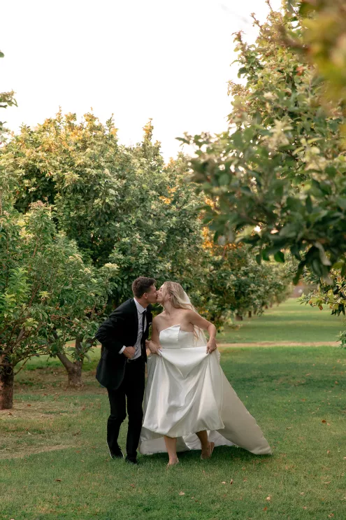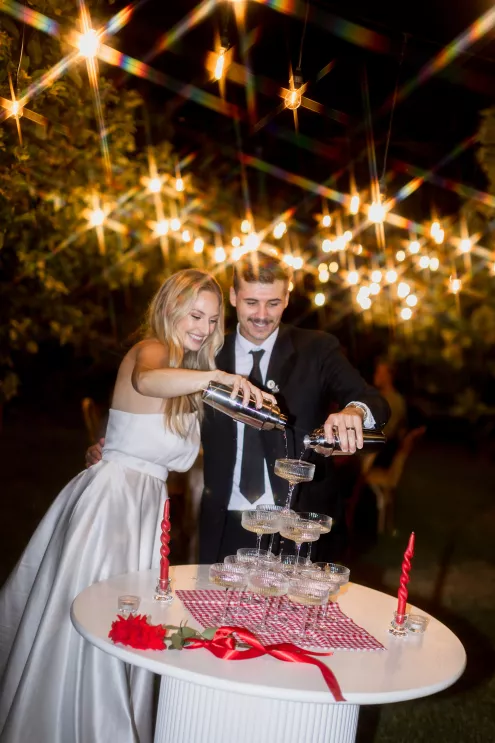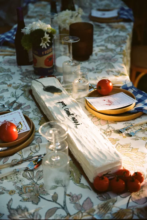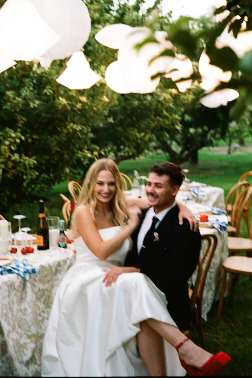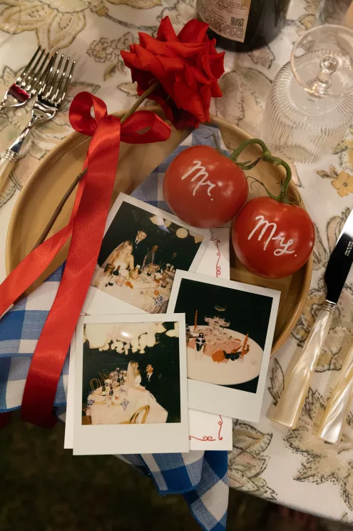 Bailey Shea imagined an Italian dinner party lit solely by lanterns and candles, where the couple’s loved ones could gather to celebrate. She chose to forgo formal floral arrangements on the table, instead selecting a few stems growing in the surrounding gardens to add a natural finishing touch. The design created an approachable, down-to-earth, warm vibe for guests, nestled in the beauty of a private orchard.