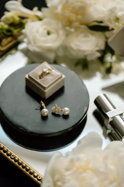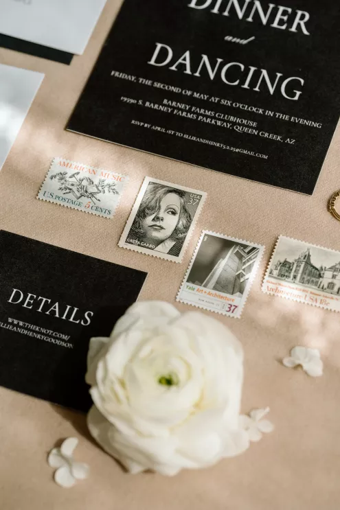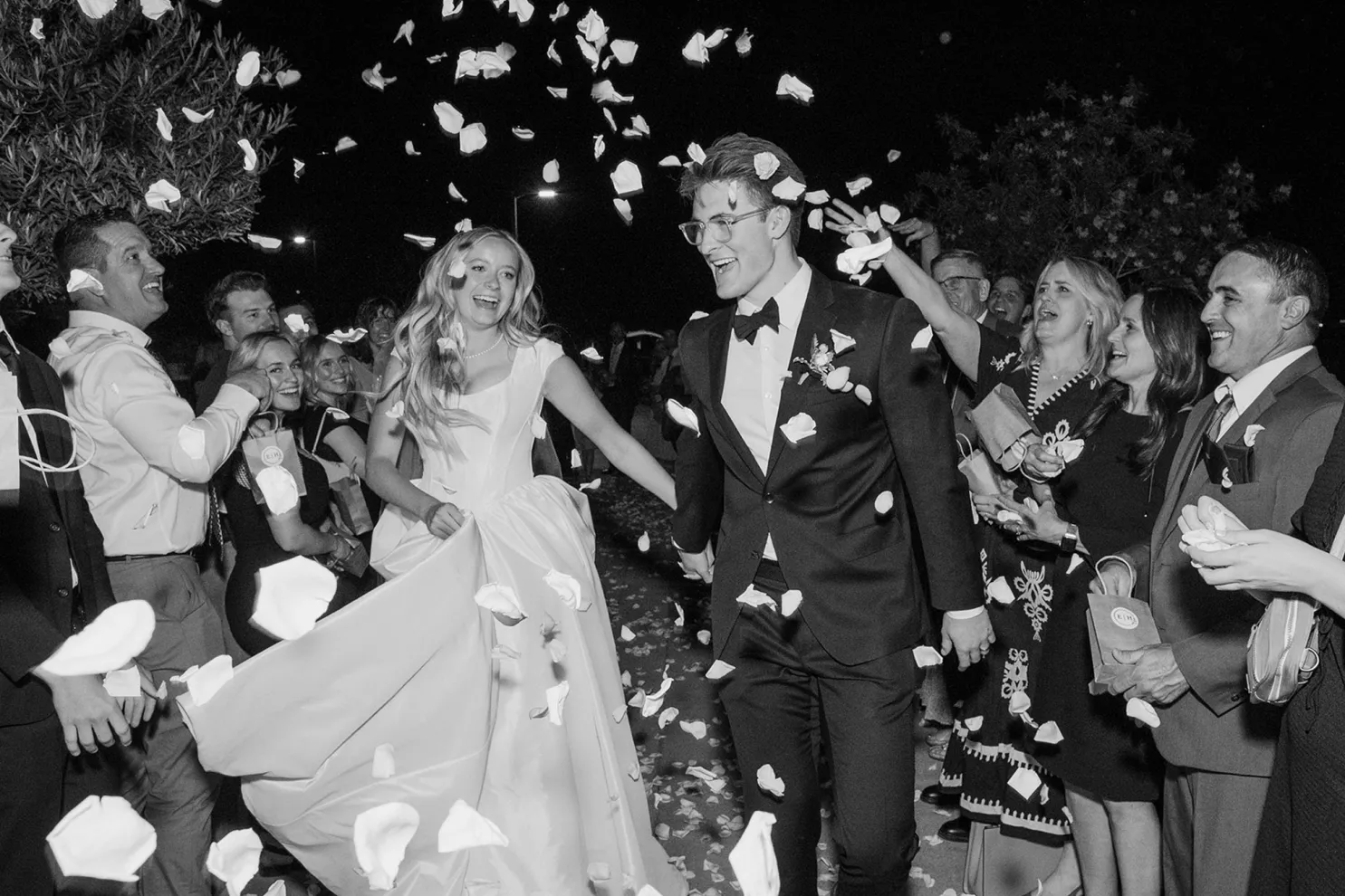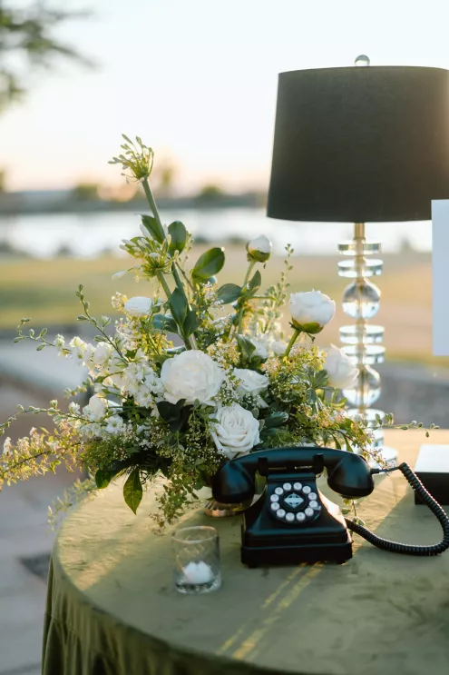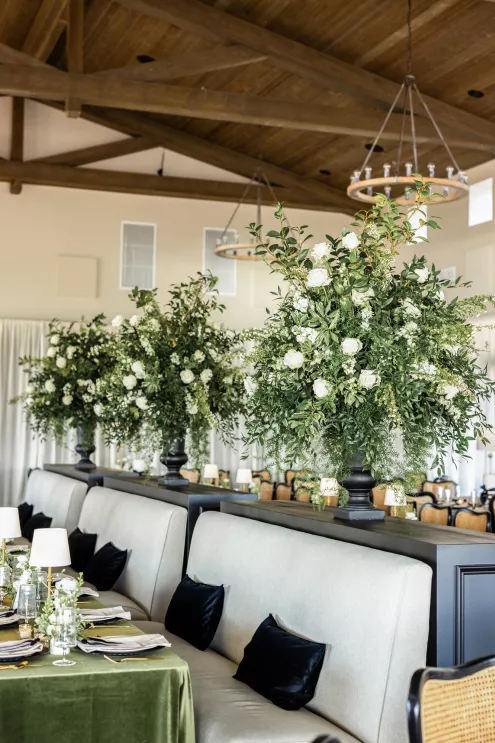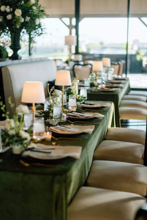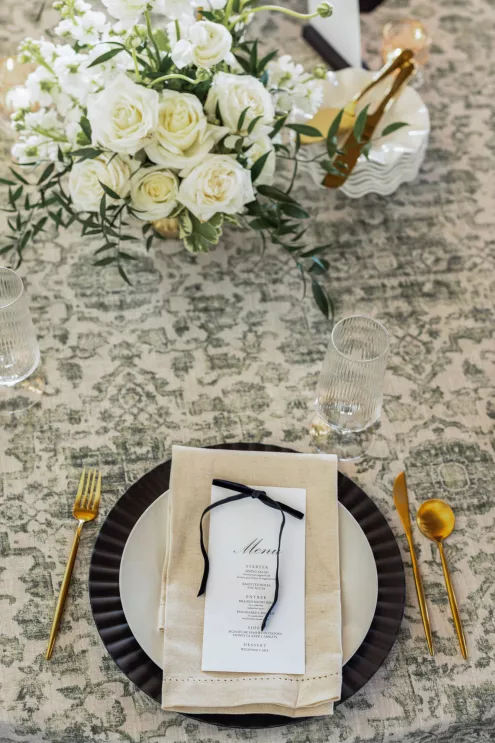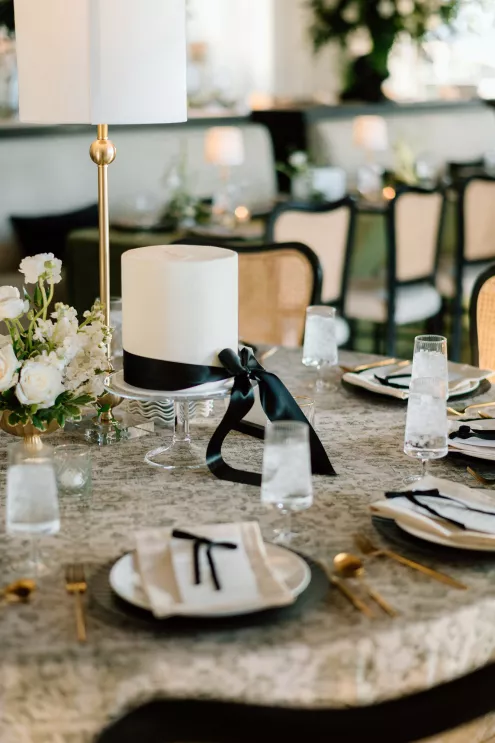 Henry and Ellie met one month into their freshman year of college and realized their lives were fated to intertwine after discovering their grandparents’ decades-long friendship. Embracing their intergenerational connections, the pair chose Ellie’s family farmland to host their lavish wedding. Dressed in classic wedding-day attire—Henry in a tux and Ellie in a cap-sleeve ballgown accented with heirloom jewelry—the pair exchanged vows in a private religious ceremony officiated by the bride’s grandfather. The reception at the family’s farm began with a unique display of wedding dresses worn by the women of the bride’s and groom’s families—the oldest dress being more than 100 years old. An elegant black-and-white palette unfolded, amplified by velvet green tablecloths and touches of metallic gold. The ambiance was thoughtfully balanced with one-of-a-kind details such as a custom lemonade bar and “his” and “hers” signature milkshakes—M&M and cookies and cream, respectively. In a truly unique touch, a wedding cake was the focal point of every table (a total of 18 cakes!); when it came time for cake, the couple joined their guests at each table for a personalized cake-cutting. An evening of dancing ensued, set to both a live jazz band and a prerecorded DJ set by the groom. For Ellie and Henry’s wedding day, the aim was simple: to share what they love with the ones they love.