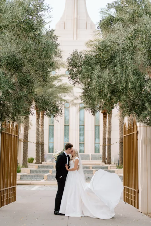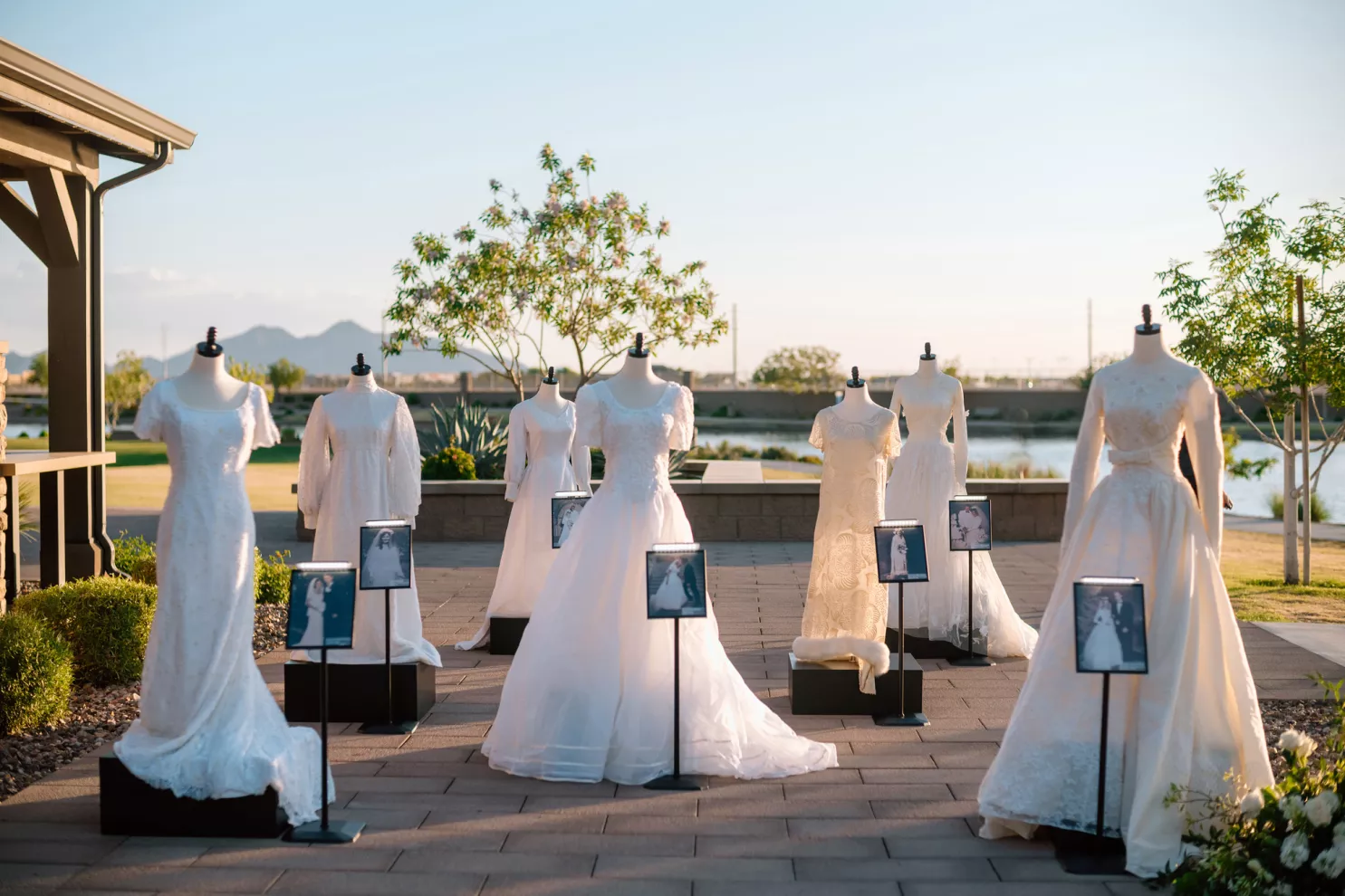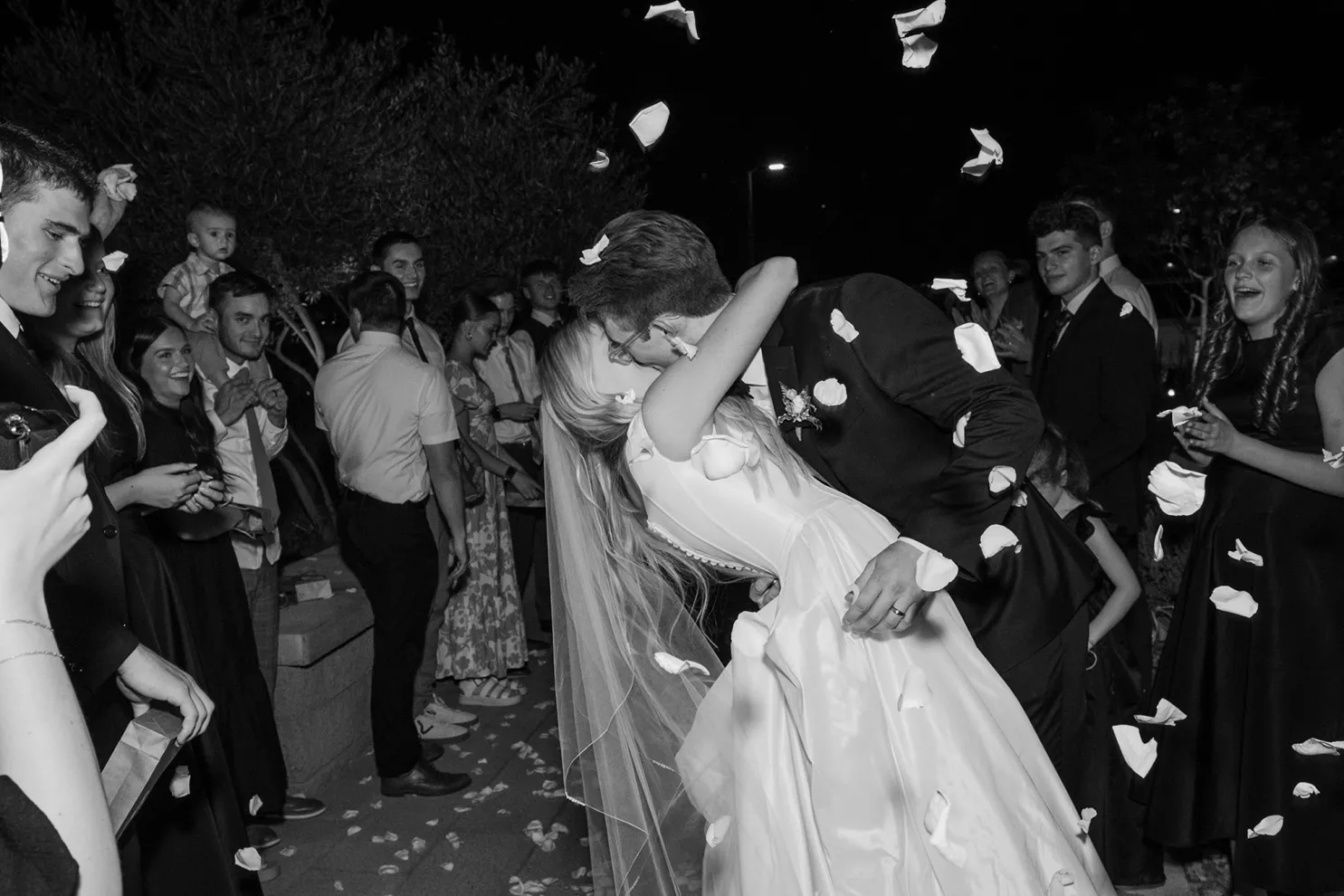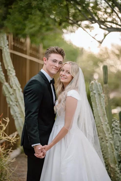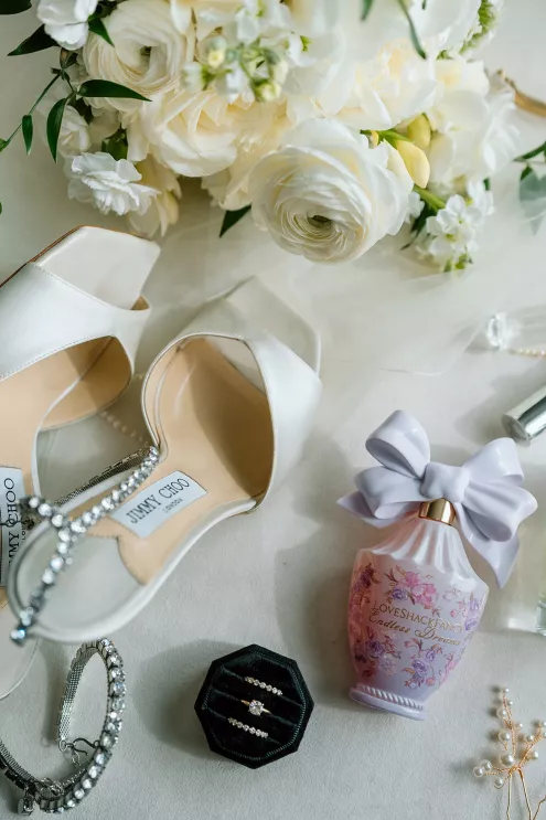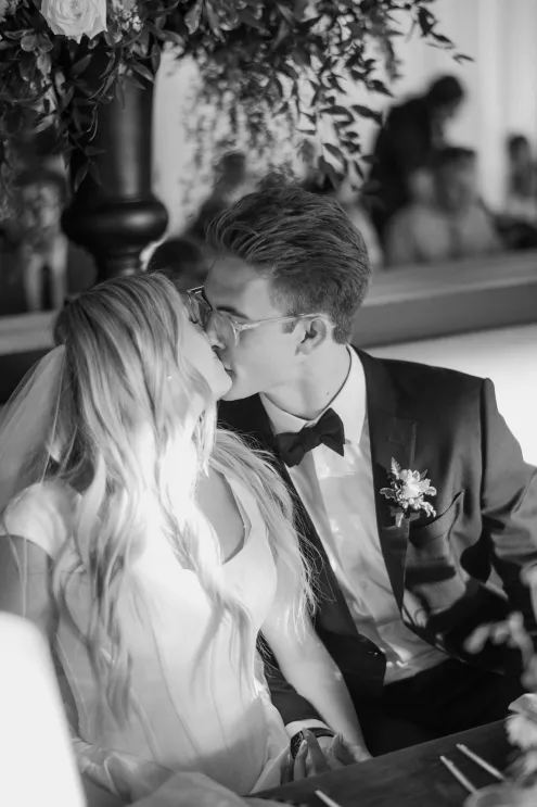 Henry and Ellie met one month into their freshman year of college and realized their lives were fated to intertwine after discovering their grandparents’ decades-long friendship. Embracing their intergenerational connections, the pair chose Ellie’s family farmland to host their lavish wedding. Dressed in classic wedding-day attire—Henry in a tux and Ellie in a cap-sleeve ballgown accented with heirloom jewelry—the pair exchanged vows in a private religious ceremony officiated by the bride’s grandfather. The reception at the family’s farm began with a unique display of wedding dresses worn by the women of the bride’s and groom’s families—the oldest dress being more than 100 years old. An elegant black-and-white palette unfolded, amplified by velvet green tablecloths and touches of metallic gold. The ambiance was thoughtfully balanced with one-of-a-kind details such as a custom lemonade bar and “his” and “hers” signature milkshakes—M&M and cookies and cream, respectively. In a truly unique touch, a wedding cake was the focal point of every table (a total of 18 cakes!); when it came time for cake, the couple joined their guests at each table for a personalized cake-cutting. An evening of dancing ensued, set to both a live jazz band and a prerecorded DJ set by the groom. For Ellie and Henry’s wedding day, the aim was simple: to share what they love with the ones they love.