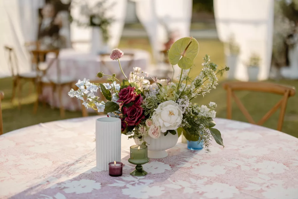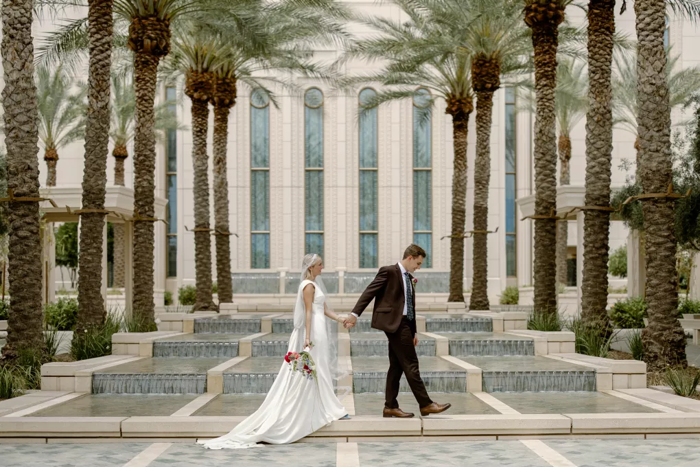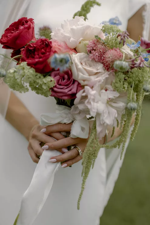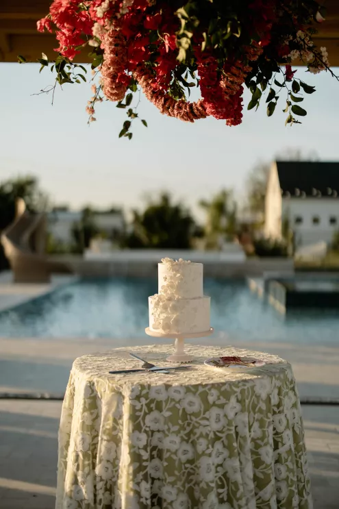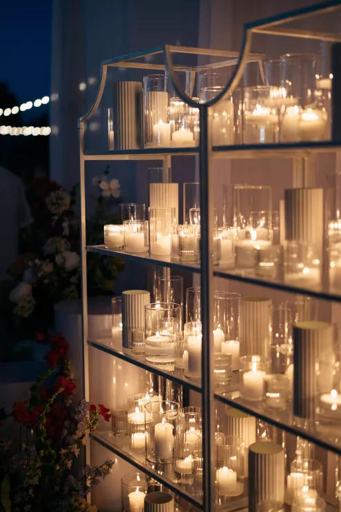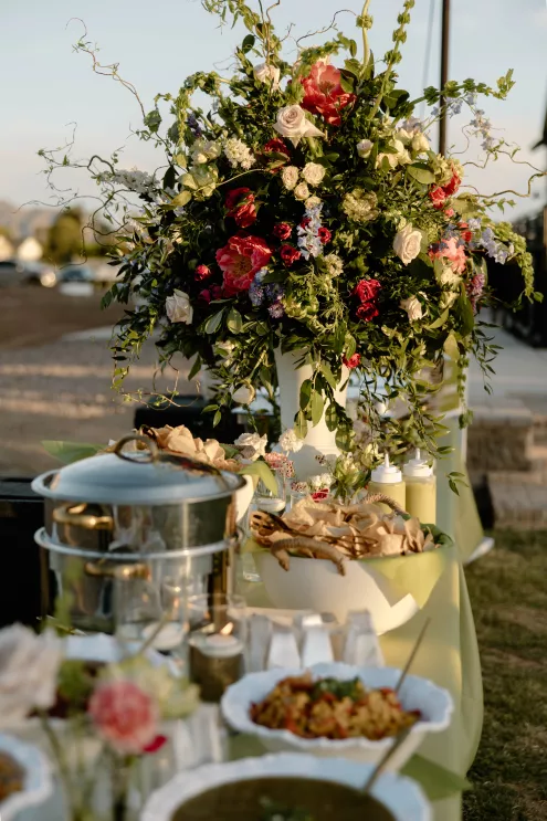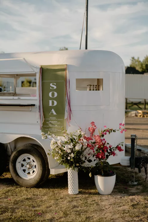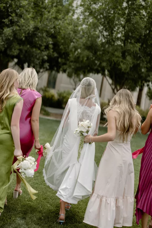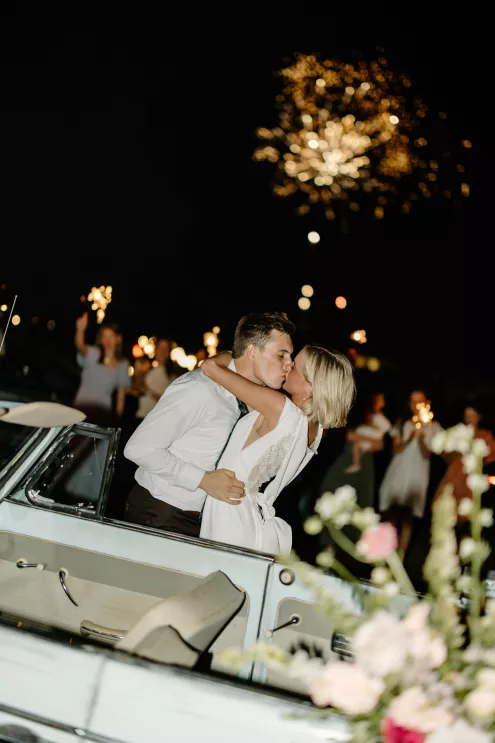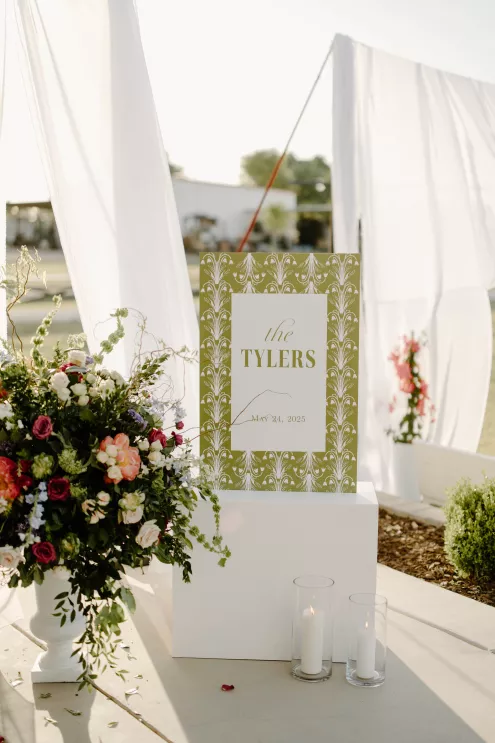 High school sweethearts Abigail and Brody knew their wedding would be a joyful celebration. Following in the footsteps of their respective parents and grandparents, they exchanged vows at their temple before welcoming loved ones to a magical reception at Brody’s childhood home. The evening reflected their love of color, whimsy and vintage charm. Guests were greeted by custom signs featuring the couple’s monogram and Abigail’s favorite flower, lily of the valley. The home became a kaleidoscope of personality: vintage-patterned linens, a baby-blue Volkswagen Beetle and chic décor. Under a wooden ramada with a chandelier dripping in blooms, guests danced the night away to tunes spun by a family friend. Garden-inspired arrangements created a an ethereal meadow, while a caricature artist, specialty sodas from a refurbished horse trailer and antique postcards for messages added personal touches. Abigail’s retro-inspired gown featured a lace back panel, her “something blue” and a chic pair of shoes while the bridesmaids wore jewel-toned dresses with crisp white bouquets. The night ended with a firework display and the couple’s getaway in the baby-blue Beetle