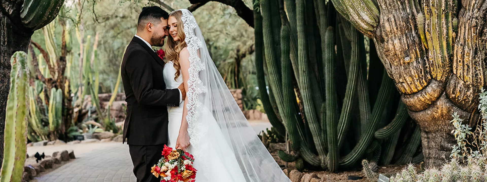 Instead of viewing marriage as the beginning of their love story, high-school sweethearts Samuel and Brianna Aguiar saw it as a beautiful new chapter in an already rich, true and authentic partnership. In the 13 years since they met, the pair has shared countless milestones, from college to cross-country moves and more. Wanting a heartwarming symbol of the lives they had already blended together, the couple chose a design that reflected the joining of their heritages through the use of traditional Mexican details and classic American ceremonies. A grand arch of fuchsia bougainvillea perfectly complemented the desert landscape, and the flowers were also incorporated in romantic bouquets of ivory blooms and gold, peach and orange roses. Brianna stunned family and friends as she made her way down the aisle, donning a cathedral-length Mantilla veil that was hand made by Samuel’s aunt in Mexico. To top off the ceremony space, white papel picado banners hung over the seating and raised platform where the bride and groom said “I do,” a delicate harmony to the overall vibrant scene. The elegant design of the tablescapes allowed more personal touches, such as ceramic plates—hand-painted in a deep terra-cotta color to match the fall motif—and Talavera-painted tile table numbers to truly shine. Following the traditional American timeline of celebrations, Samuel and Brianna’s loved ones dined on classic Mexican dishes before dancing the night away to the music of Banda, Bachata and Mariachi, an exquisite experience filled with love, thought and culture.